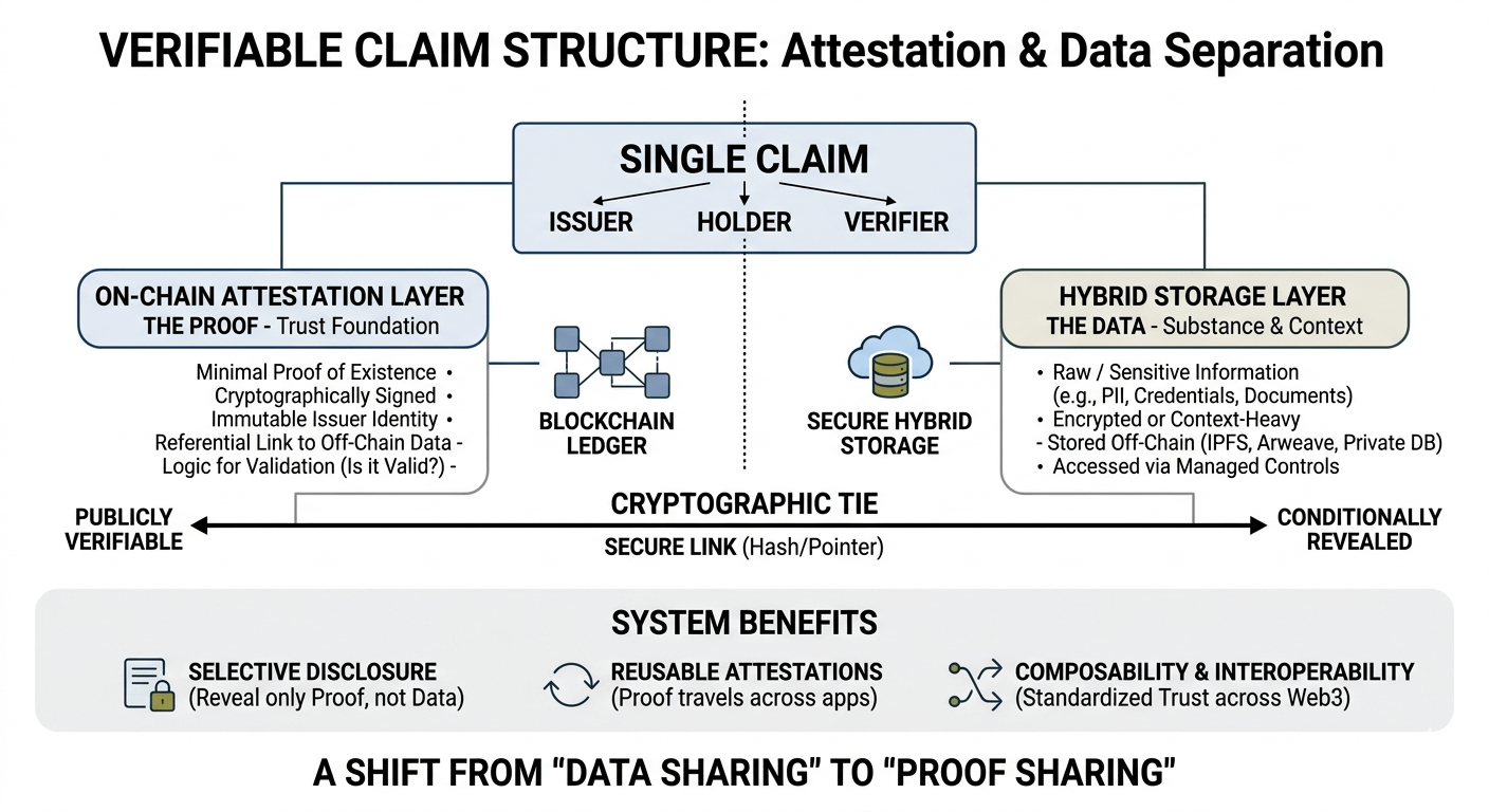 At first glance, “hybrid storage” sounded like another variation of the usual Web3 privacy discussion. But the deeper I followed the design, the more I realized it’s not just about storing data differently it’s about splitting what a claim actually is into two verifiable layers that behave independently, yet remain cryptographically tied together.
