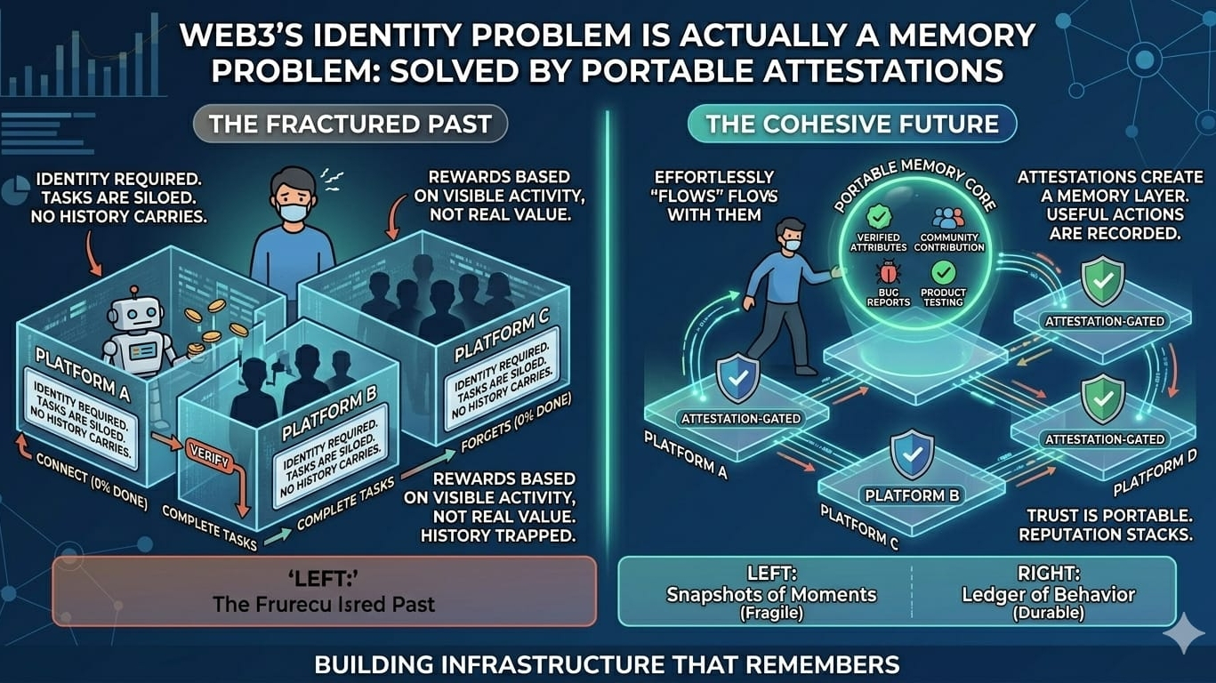What’s broken in crypto right now is not just identity, it’s memory. You verify on one app, sign a message, maybe finish some tasks, and prove you’re a real user, but when you move to another app, none of that follows you, so you have to start all over again. That is the real problem. Everyone talks about identity, reputation, and trust, but most of the time none of it actually carries across platforms. There is no shared memory, no continuity, and that turns the whole experience into the same loop every time: connect, sign, verify, repeat. That is not real infrastructure, it is just friction. Token distribution has the same problem. Projects say they want to reward real users and real contributors, but in practice they usually reward whatever is easiest to measure, like clicks, trades, snapshots, and task lists. Bots can farm that, sybil users can farm that, and people quickly learn how to follow the pattern just to get counted. Meanwhile, someone who actually helped a community, tested a product, reported bugs, or added real value often gets ignored because their contribution does not fit into a simple checklist. So the system ends up rewarding visible activity instead of real value. That is why the idea behind Sign Protocol matters. It is trying to create a memory layer through attestations, so useful actions do not stay trapped inside one app. If something real happened, it can be recorded, checked later, and potentially recognized somewhere else. That kind of portability matters because trust needs history. If every platform resets you back to zero, then reputation cannot grow, contribution cannot stack, and trust cannot build over time. Of course, this does not solve everything. New questions come up right away, like who gets to issue attestations, who can be trusted, how farming can be prevented, and whether people should be able to recover from old mistakes. But those are still better problems than the current setup, because right now the system mostly acts like your past does not exist. And a system with no memory cannot create real trust. That is why this conversation should not only be about identity or airdrops or anti-bot filters. It should be about memory, portable memory, verifiable memory, and building infrastructure that remembers what users have actually done instead of forcing them to prove themselves again and again.