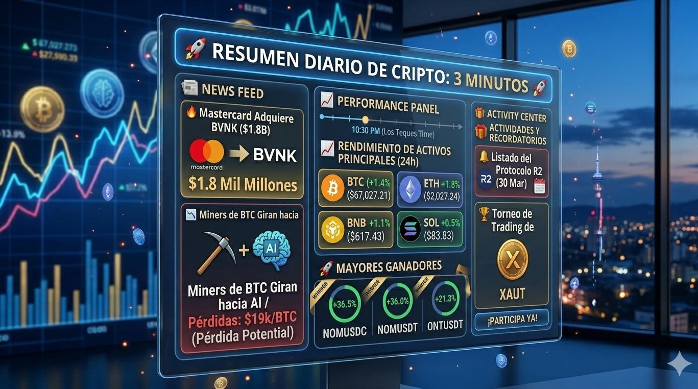 BTC:+1.4% — Actualmente cotizando alrededor de $67,027.21, mostrando una ligera recuperación después de las recientes caídas.
