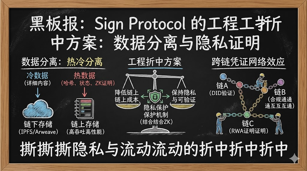 存储层面,Sign的思路是原始数据和证明分离:冷数据(详细内容)放链下并结构化,热数据(哈希、状态、结论证明)放链上,结合ZK处理隐私场景。这是个工程上的折中方案,能明显降低链上成本,同时保持可验证性和一定隐私保护。它把结构标准化、跨链兼容、数据追溯几个关键点衔接起来,适合链上信用、身份这类大规模应用方向。