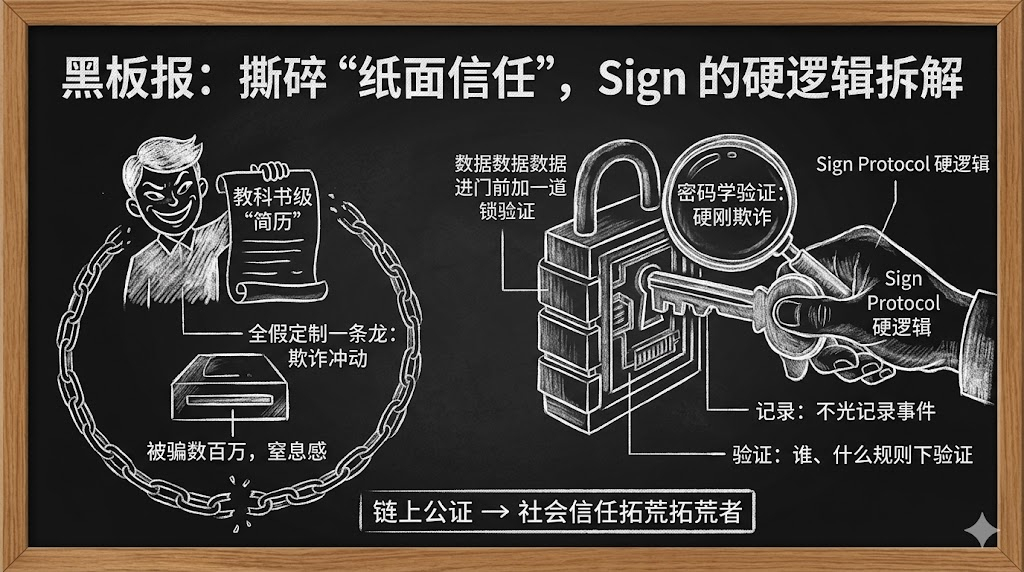 年前那会儿我真是被上了一课。公司谈了个大合作,对方高管履历漂亮得跟教科书似的,海外名校、顶级投行,背调做了仨月,愣是没挑出毛病。结果呢?三个月后差点把我们核心客户的底单一锅端了。后来托了关系才查明白,那套光鲜亮丽的东西全是假的,从学历到流水,一条龙定制。那段时间我整个人都不太好,不是心疼钱,是那种被人当面把你对信任的底线撕碎的感觉,太窒息。从那儿以后我就开始死磕底层信誉协议。@SignOfficial 就是那时候进的视野。好多人觉得它就是个链上公证工具,但我觉得它是在干一件更狠的事。用密码学去跟人性里那些“我赌你查不出来”的冲动硬刚。
