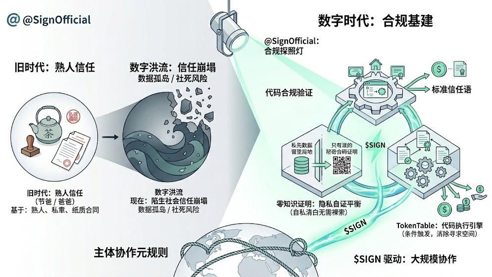 我爷爷那辈人做生意,靠的是在茶馆里一句话,再盖个私章。信任的半径,超不出镇上那条街。我爸那代,信任的载体变成了盖着红戳的纸质合同和存折,半径扩展到了市里、省里。到了我这代,全球化了,我的合作伙伴在迪拜、在法兰克福,我们互不相识。一夜之间,传承了几代人的“熟人信用网络”崩塌了。取而代之的,是面对陌生系统时无处不在的社死风险:你的数字身份可能被盗用,你的跨境合同可能因管辖权沦为废纸,你的资产证明可能因为某个中心化服务器宕机而无法验证。这种崩塌,不是缓慢的腐蚀,而是数字洪流下的瞬间溃堤。我们被迫进入一个所有交互都默认对方不可信,但又必须完成协作的黑暗森林。这时我发现,@SignOfficial 构建的,正是一套让我们能安全走出森林的数字探照灯与路径标识系统。它提供的不是温情脉脉的熟人关系复刻,而是一套冰冷、精确但极其可靠的合规性验证基础设施。这本质上是一次从依赖人情背书到信仰代码合规的认知革命。
