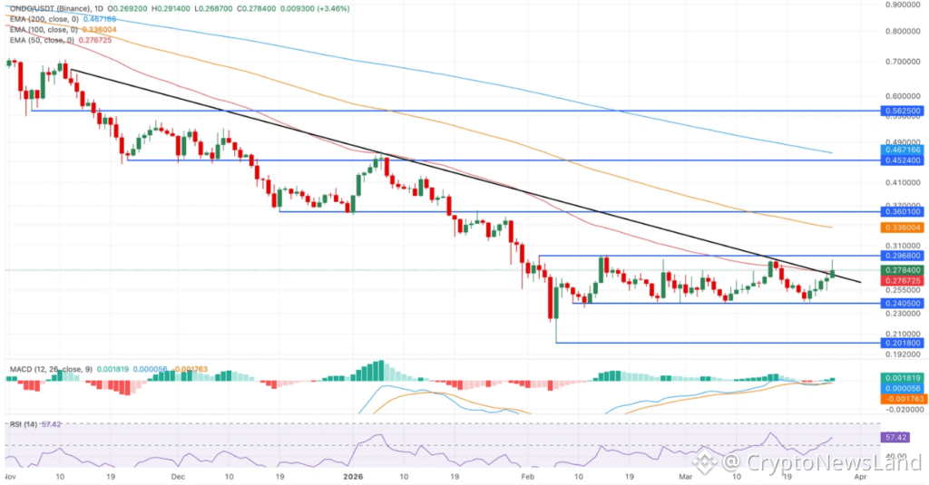 Technically, Ondo trades near a descending resistance line close to the fifty-day exponential moving average around $0.2767, where a breakout could open higher targets.