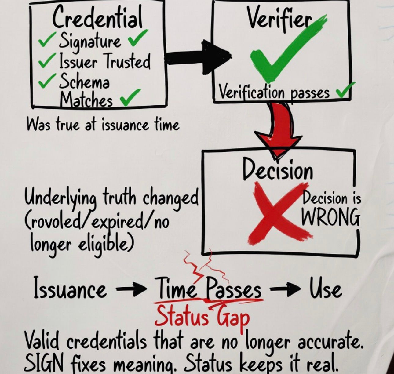 This is where things start to break in a quiet way. The credential looks valid. Verification passes. There is no visible error. But the decision based on it is wrong because the state behind it has already changed.