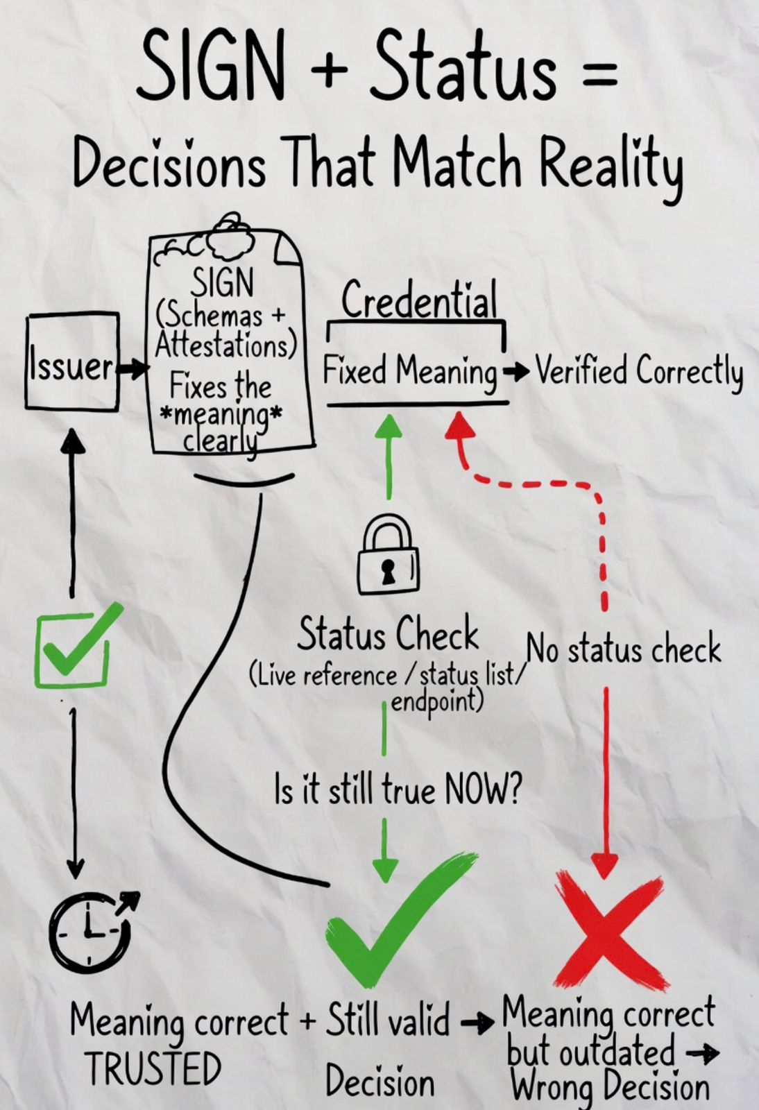 In practice, this means attaching a live reference to the credential a status list or endpoint that must be checked at the moment of use. Without that step, the system is relying on a snapshot, not current state.