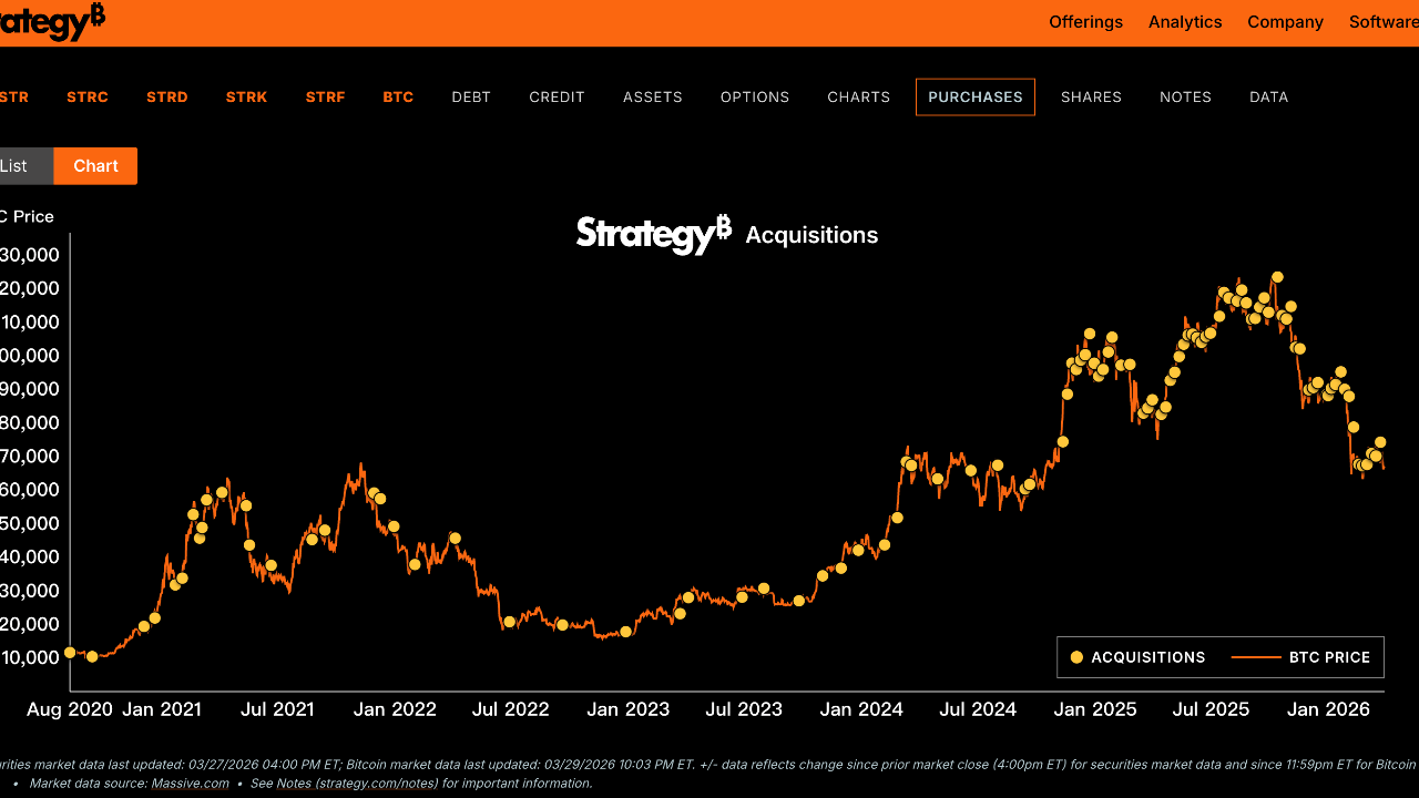 Strategy currently holds 762,099 bitcoin at an average acquisition price of $75,694. Shares remain approximately 76% below their all-time high, with bitcoin trading below $67,000.