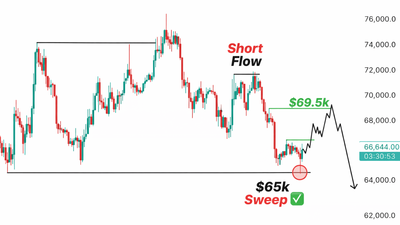 Theo góc nhìn của mình, hiện có hai kịch bản đáng chú ý. Kịch bản đầu tiên là giá có thể hồi lên quanh vùng 69.000 USD sau khi vừa trải qua một đợt thanh khoản lớn. Đây là kiểu nhịp bật lại khá thường thấy sau khi market quét stop mạnh, khiến nhiều người lầm tưởng rằng xu hướng tăng đã quay lại. Nhưng thực tế, những nhịp hồi như vậy đôi khi chỉ là phản ứng kỹ thuật ngắn hạn trước khi thị trường chọn hướng tiếp theo.