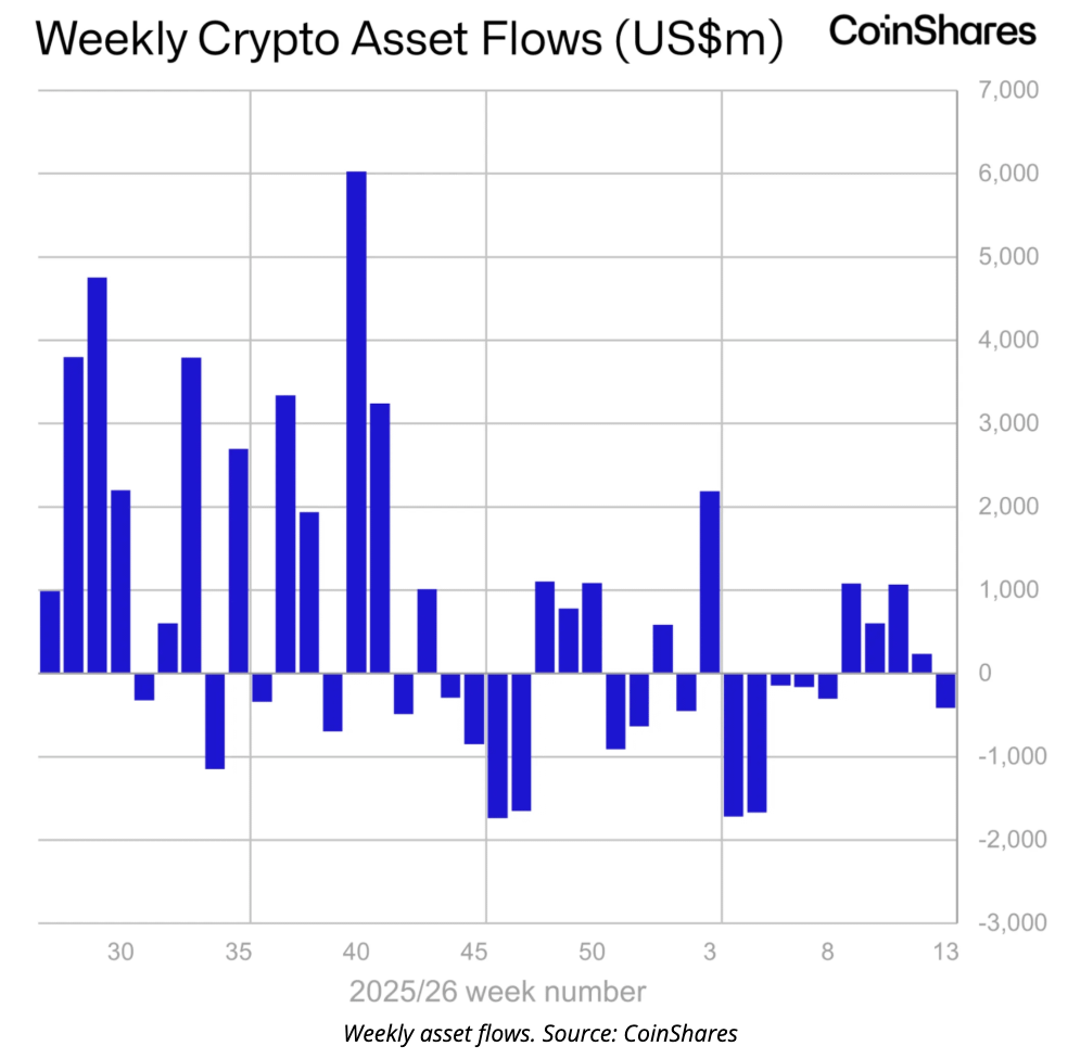Crypto investment products saw $414 million in weekly outflows, marking the first reversal in five weeks as rising inflation risks, Federal Reserve policy uncertainty, and escalating Middle East tensions weighed on market sentiment.