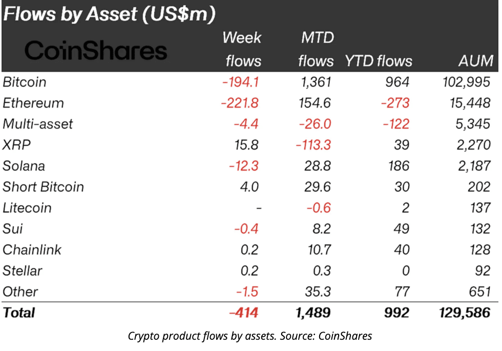 Crypto funds recorded $414 million in outflows, ending a 5-week inflow streak.