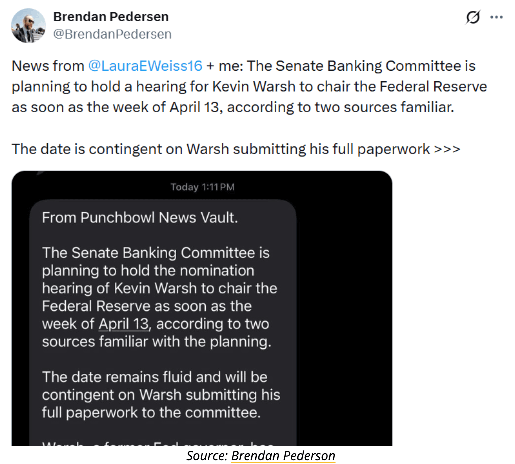 Senate Banking Committee may hold hearing for Kevin Warsh as soon as week of April 13.