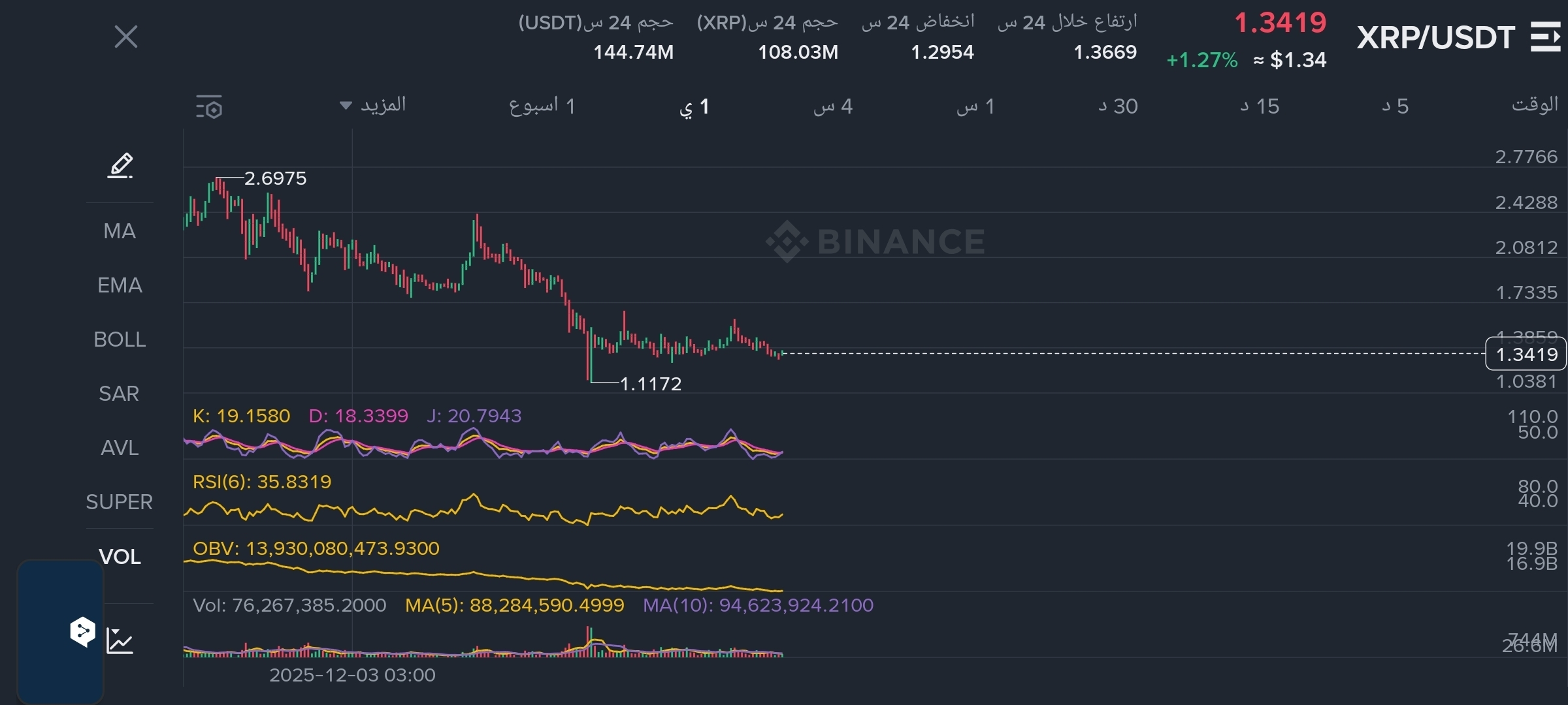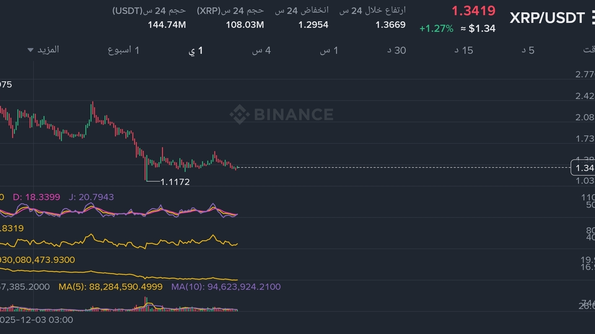 منطقة التجميع الذهبية: السعر مستقر حالياً عند 1.34$، وهو يتداول في نطاق ضيق فوق القاع الأخير 1.11$. تاريخياً، هذا النوع من "الضغط السعري" العرضي هو الوقود الذي يسبق الانطلاقات الكبيرة.