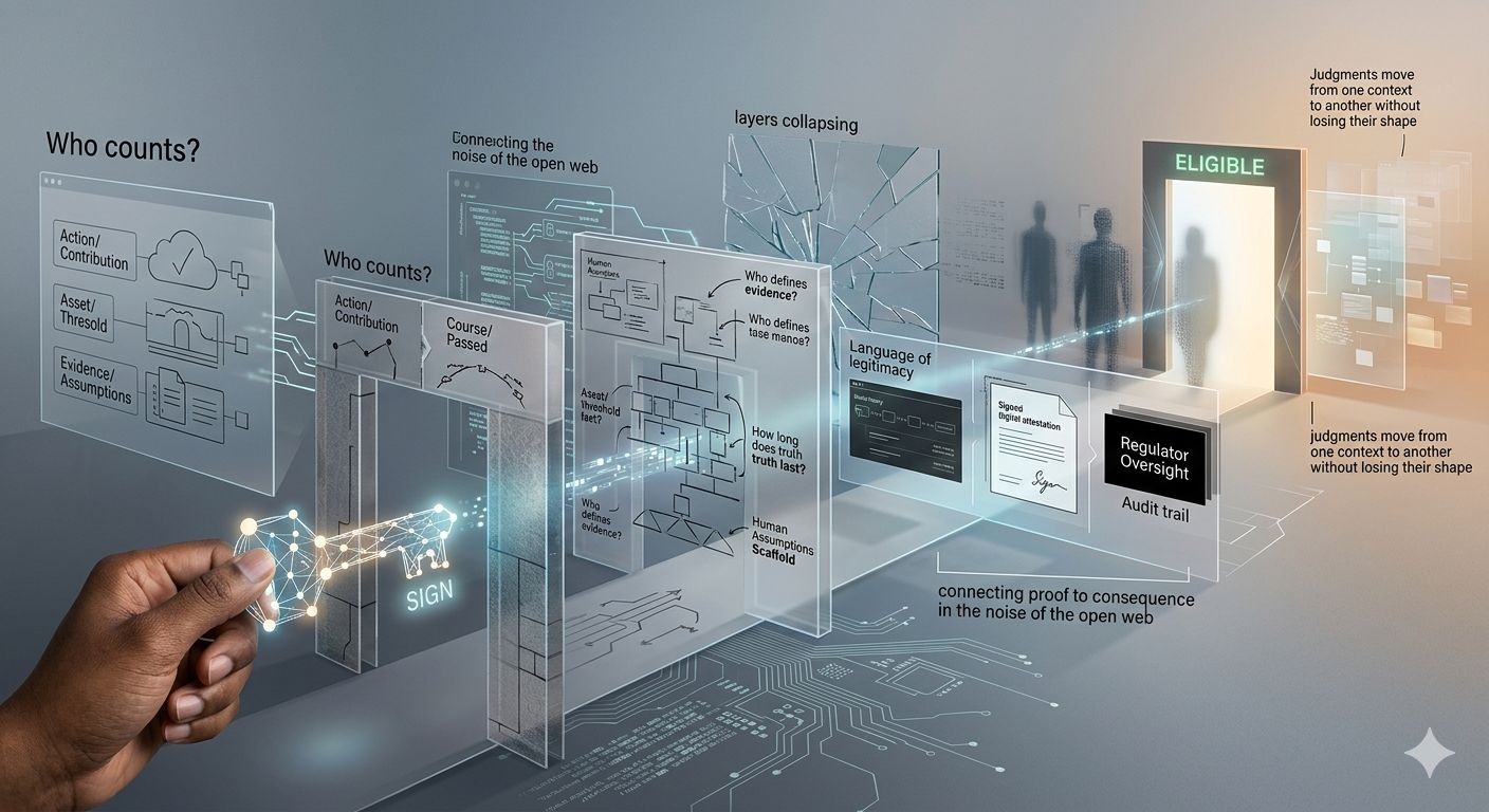 A system might track an action a contribution made, an asset held, a course passed, or a threshold crossed. Within that sandbox, the record is clear. But the moment that record needs to travel, the certainty evaporates. We often mistake a "simple" process for a solved one, failing to realize the difficulty has just been pushed out of sight. Behind every clean Eligible, Verified, Claimable lies a scaffolding of human assumptions. Someone had to draw the line. Someone decided what counts as evidence. Someone determined how long that truth lasts before it rots.