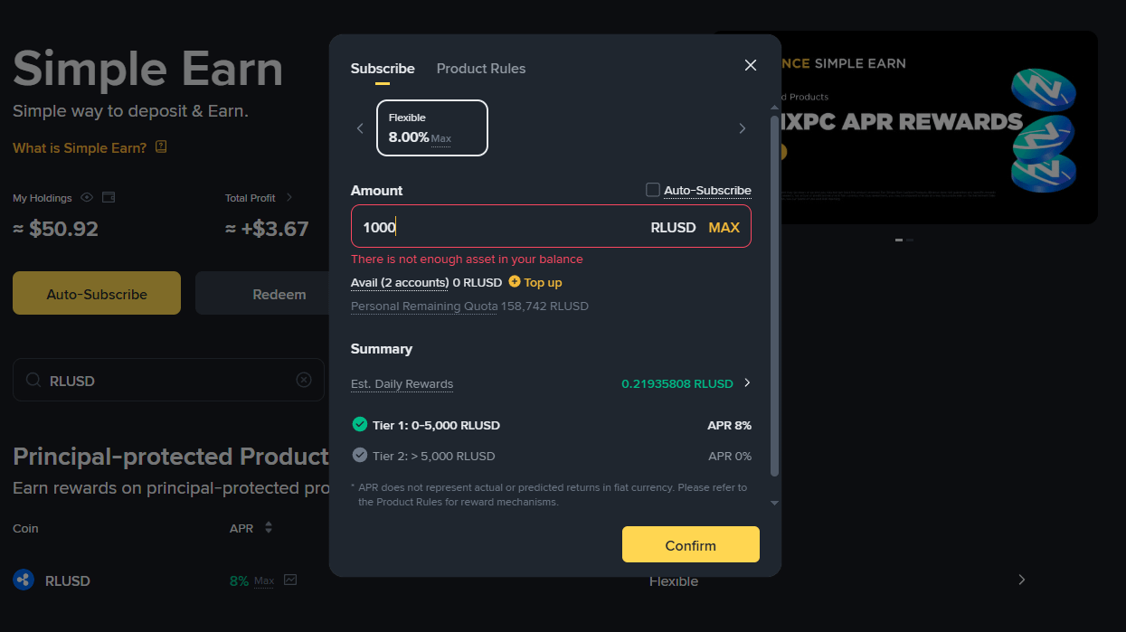 However, there is one very important detail: the up to 8% APR only applies to the portion of your subscription up to 5,000 RLUSD. Any amount above that will only receive the Real-Time APR. Binance also sets a cap of 500,000 RLUSD per user and 20,000,000 RLUSD for the entire campaign.