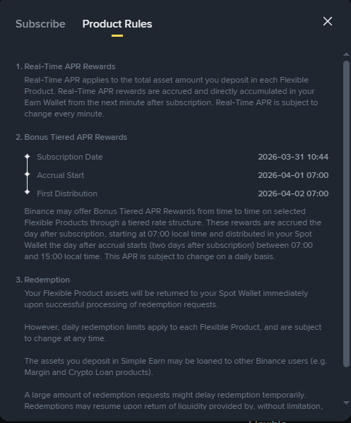 The most attractive part of this campaign is that the rewards come not only from the Real-Time APR, but also from an additional Bonus Tiered APR during the promotion period. The Real-Time APR accrues every minute into your Earn Account, while the Bonus Tiered APR is distributed daily to your Spot Account. After subscribing, the bonus starts accruing from 00:00 UTC on the following day, and the first reward is distributed one day later.