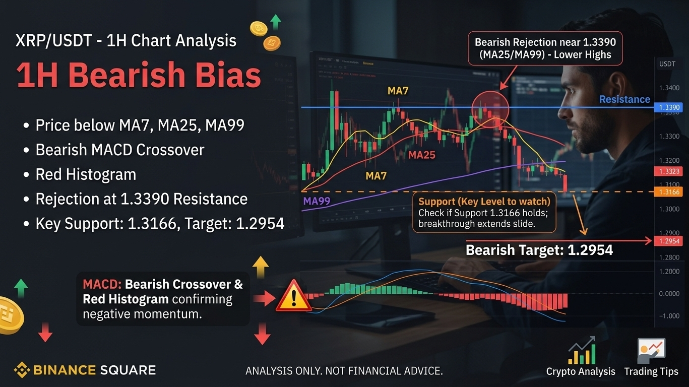 Looking at the recent candles, there is a clear bearish rejection near the 1.3390 level (MA25/MA99). The candles are forming small bodies with lower highs, suggesting that sellers are stepping in every time the price tries to bounce. The MACD histogram turning red further confirms that the short-term strength is fading.