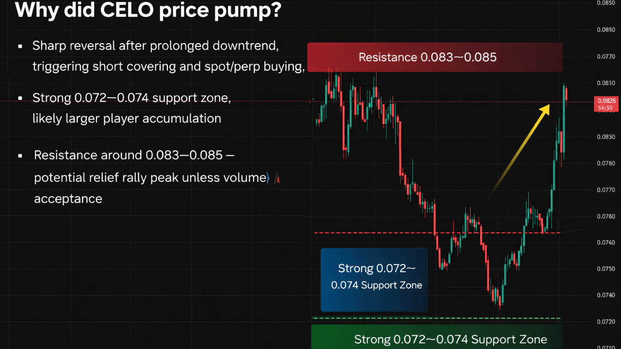 The recent pump in #CELO on the 1H chart is primarily a classic short-term liquidity-driven reversal after an extended downtrend. Price had been making lower lows into the 0.072–0.074 zone, which acted as a strong demand base—likely where larger players accumulated. The sharp bullish impulse from this level suggests a combination of short covering (liquidation of late sellers) and fresh spot/perp buying, visible through the aggressive green candles and expanding volume. Structurally, $CELO broke a minor bearish market structure (lower high sequence), flipping intraday sentiment bullish. This type of move is often amplified on derivatives pairs like Binance perpetuals, where funding imbalances and leverage unwinding accelerate upside momentum. Additionally, the reclaim of the 0.080–0.081 range signals a range re-entry, meaning price is moving back into a prior consolidation zone rather than trending cleanly yet.