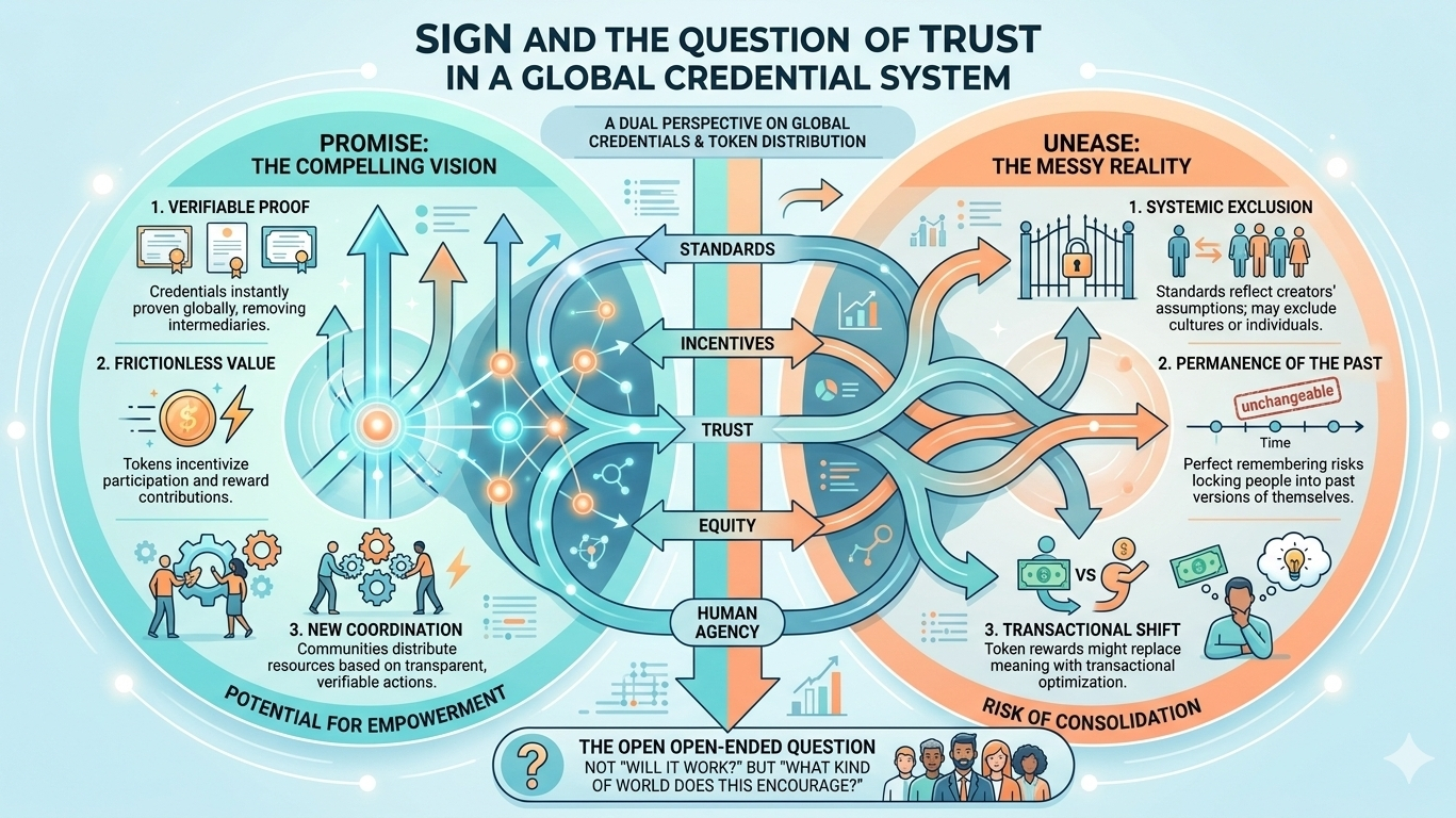 I keep coming back to this idea that we’re trying to build trust into systems that, by design, don’t trust anyone. That tension sits right at the center of something like SIGN—this notion of a global infrastructure for verifying credentials and distributing tokens. On paper, it sounds clean, almost inevitable. Of course we’d want a shared layer where credentials can be proven and value can move without friction. But the more I sit with it, the more complicated it feels.