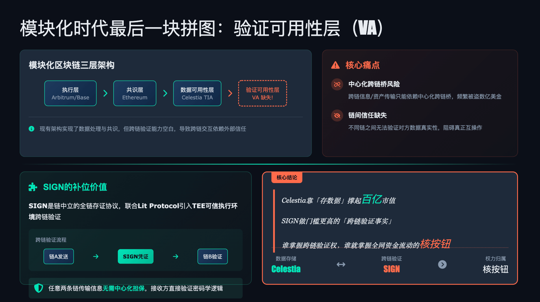 当 Celestia (TIA) 靠着“存数据”撑起百亿市值的时候,SIGN 正在做一件门槛更高、收费更狠的事——“跨链验证事实”!