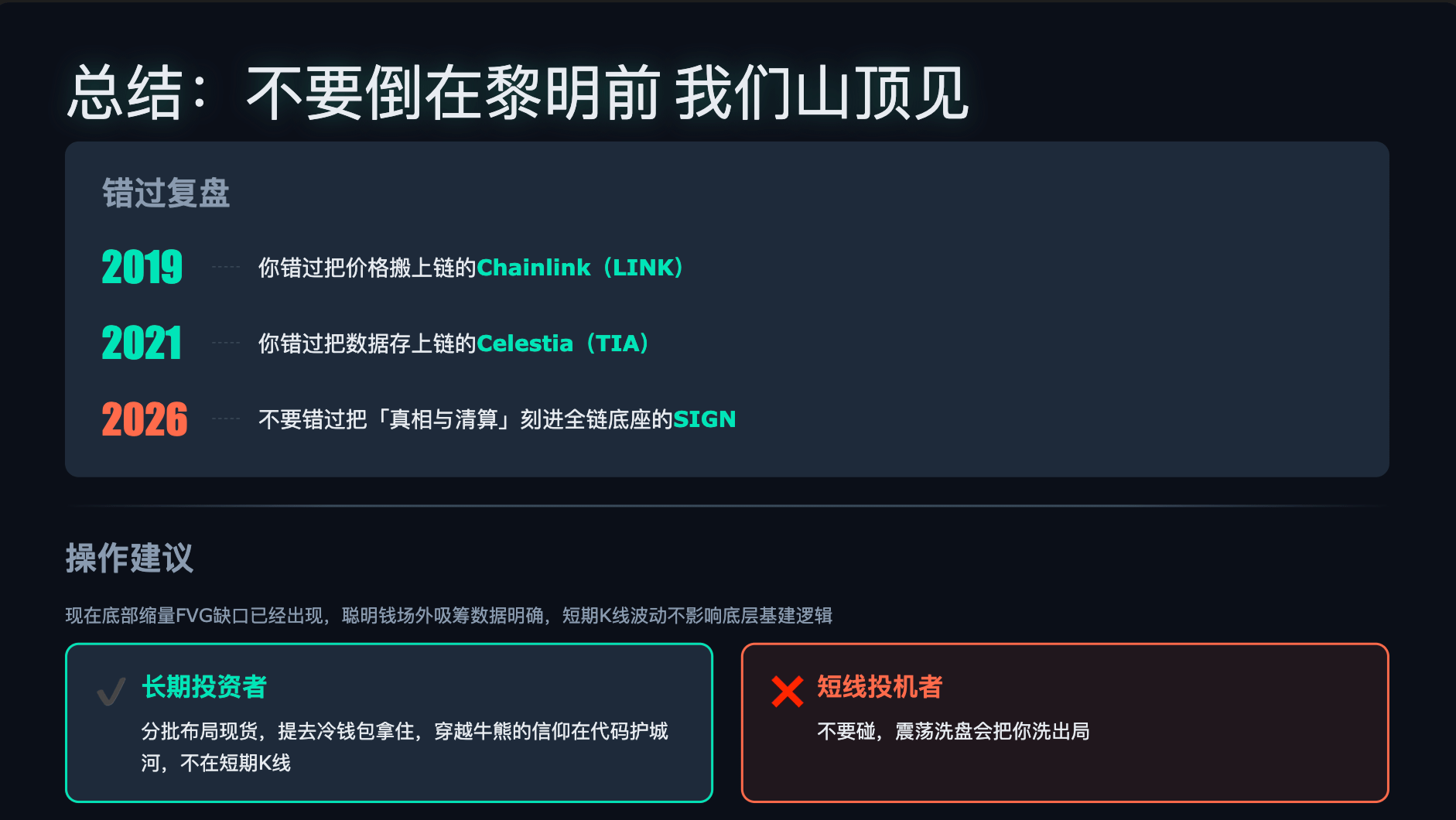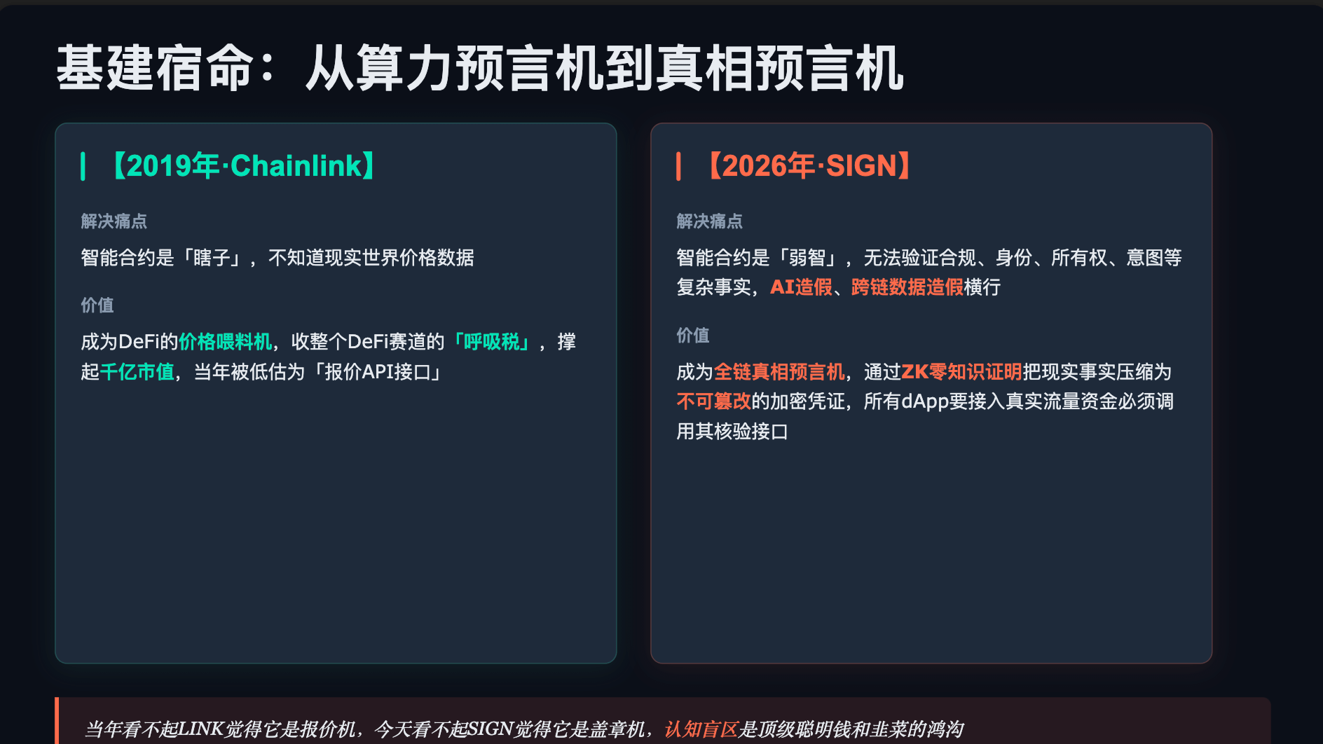 以后所有的去中心化应用,你想接纳真实的流量和资金,你就必须调用 SIGN 的接口,去核验那个密码学凭证! 当年你看不起 LINK,觉得它只是个报价机;今天你看不起 SIGN,觉得它只是个盖章机。这种认知的盲区,就是顶级聪明钱和底层韭菜之间无法跨越的鸿沟!