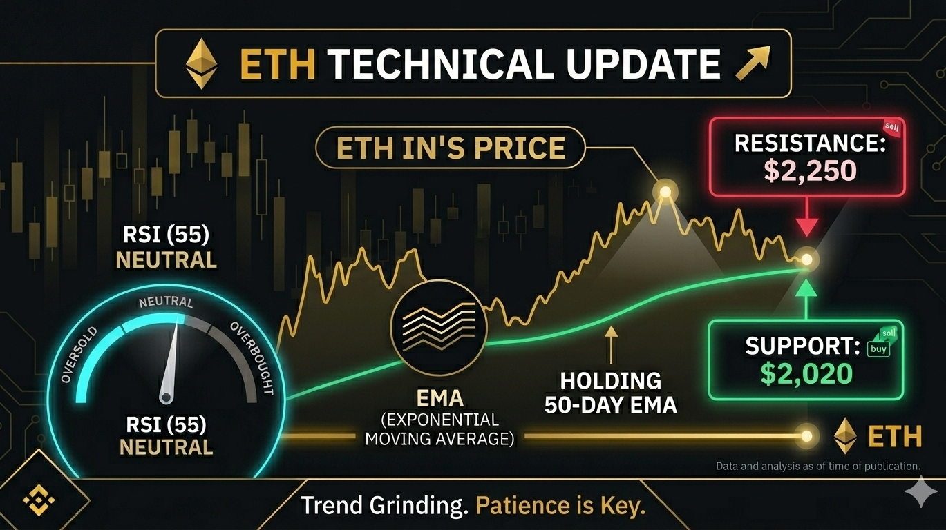 Ethereum is currently hovering around the $2,050 – $2,150 range. The market is moving sideways, trying to establish a firm direction. Here is the breakdown of the technical indicators: