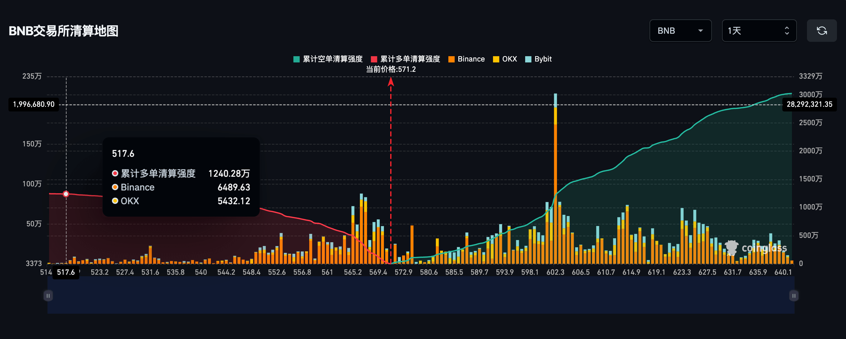 关键支撑失守:从 1 小时图看,BNB 跌破了 570 - 580 的震荡平台底部。在技术分析中,这属于“结构性破坏(Market Structure Break)”,短期内空头夺回了主导权。