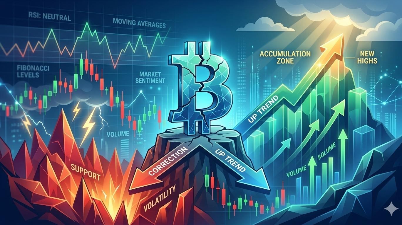 Bitcoin is in a consolidation squeeze. The long-term trajectory is still pointing up, but the immediate path is correctionary. Investors are waiting for a decisive breakout above resistance or a definitive bounce off support to dictate the next major trend. Until then, expected volatility is high, as visualized by the energetic lightning and broken paths near the local peaks.