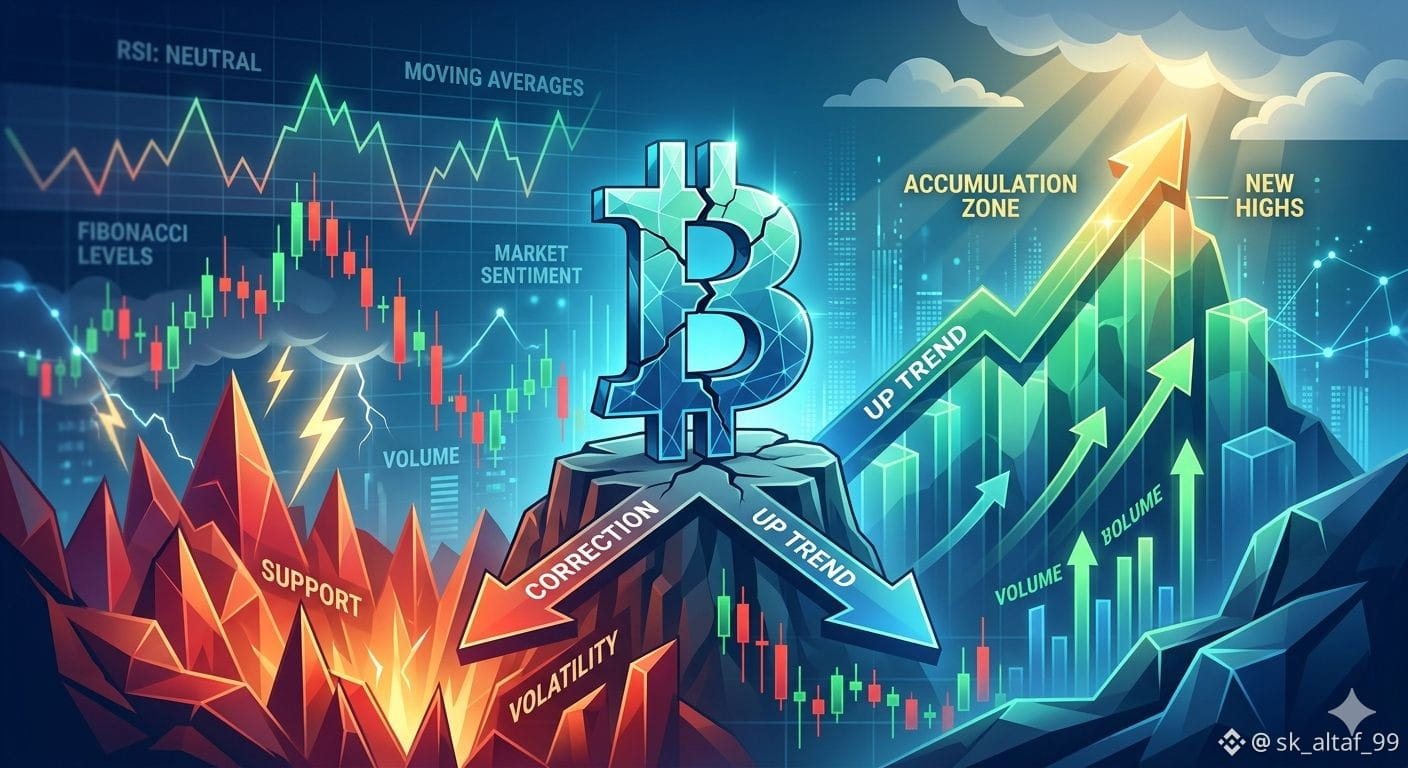 $BTC This analysis and image visualize Bitcoin's current market status. The landscape highlights a dominant "up" trend (the ascending mountain path) which suggests sustained long-term optimism. However, the presence of localized jagged formations and a cautious "correction" zone near the peak illustrates the strong resistance and volatility Bitcoin faces immediately following rapid price appreciation. The "accumulation" area near the base represents the strong support that has historically emerged during pullbacks.