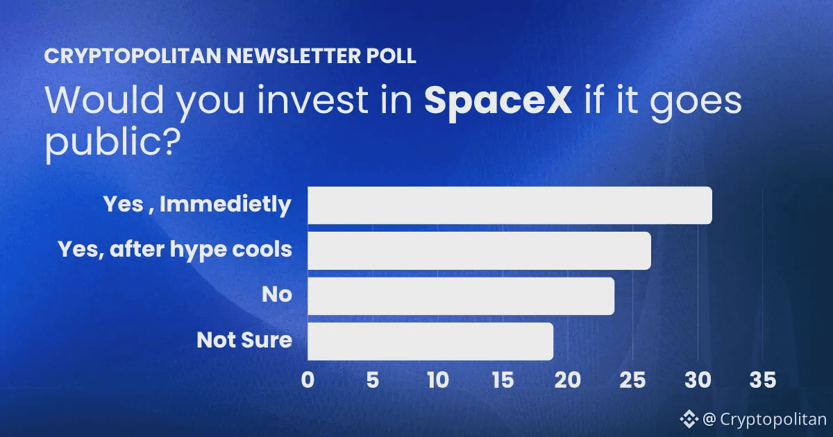 The poll conducted via the Cryptopolitan newsletter provides a useful perspective on how an audience that is primarily digitally savvy, investment aware spanning across various sectors such as crypto, AI and tech is thinking about the SpaceX IPO