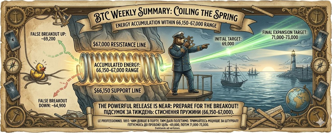 📜Цей тиждень нагадував морський бій у тумані. Ми чітко визначили межі нашої «цитаделі»: $66 150 – $67 000. Ринок намагався вирватися, але магніт консолідації повернув ціну назад.