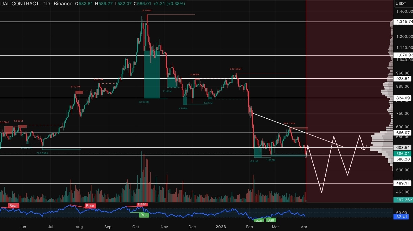 🎯 After that, the priority is further discounting. The main zone where it makes sense to look for a buyer reaction is $565 - $489.11. Below this range, a more aggressive discount will begin.