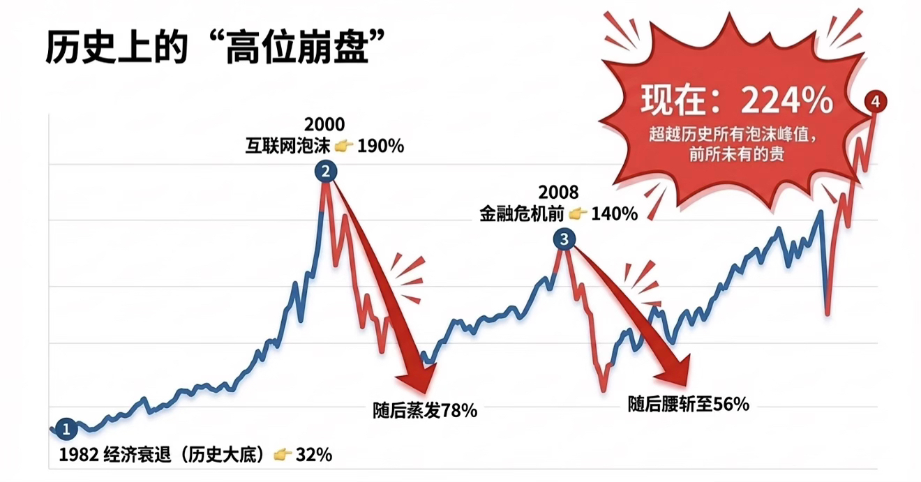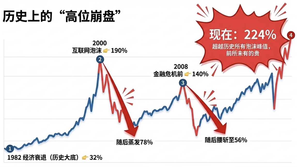 现在224%,比历史上所有泡沫的峰值都高。这不是一般的贵,这是前所未有的贵。