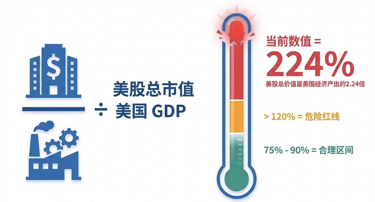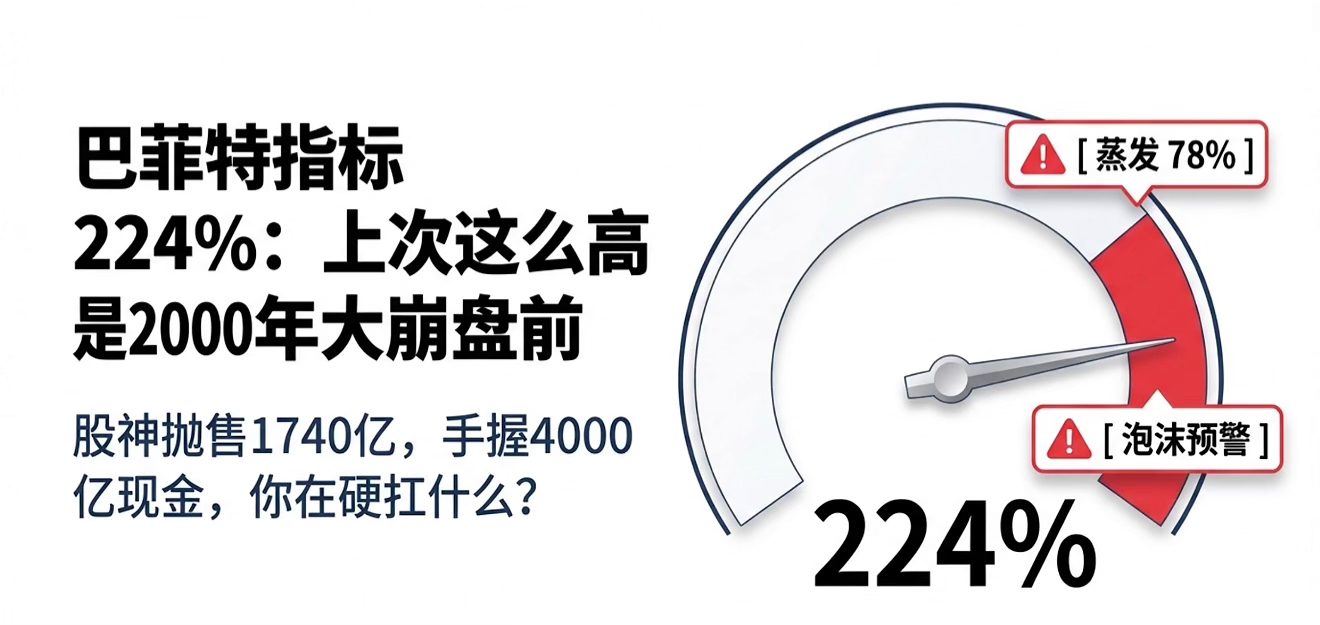 巴菲特卖了1740亿股票,手握4000亿现金,他亲手发明的估值指标飙到224%,比2000年互联网泡沫前还高30个点,那次泡沫炸了,蒸发了78%。