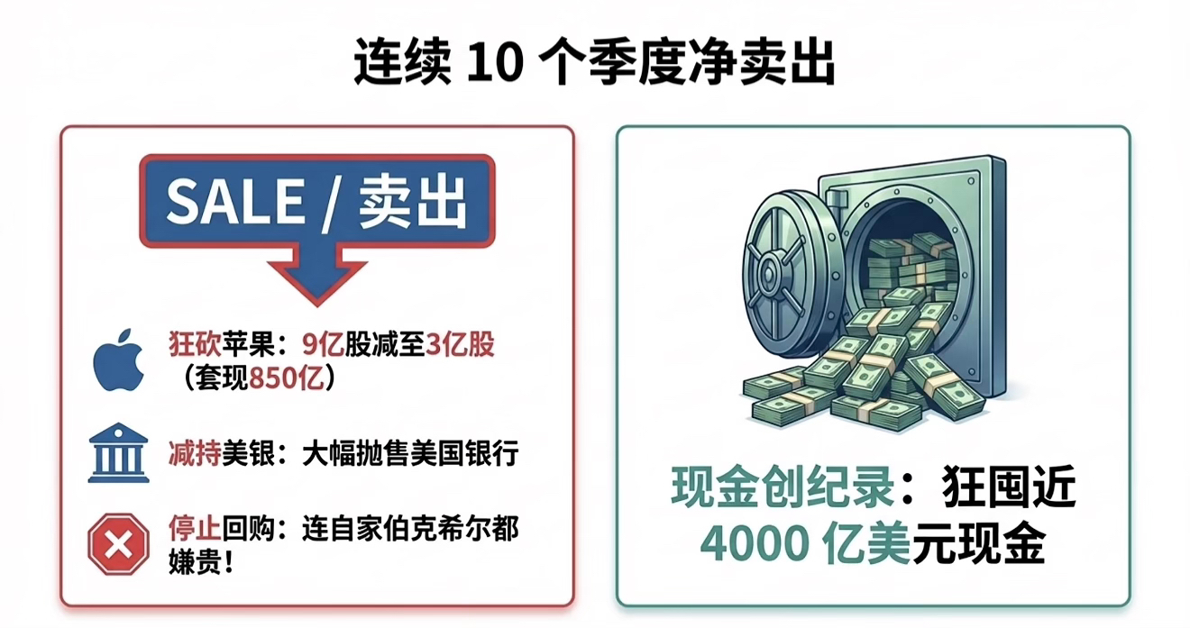 10个季度连续净卖出,苹果,从9亿股砍到3亿股,套现850亿,美国银行大幅减持。