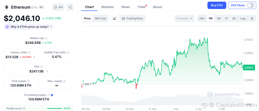 ETH trades at $2,046 on April 2 according to CoinMarketCap, holding above $2,000 support while BitMine accumulates alone.