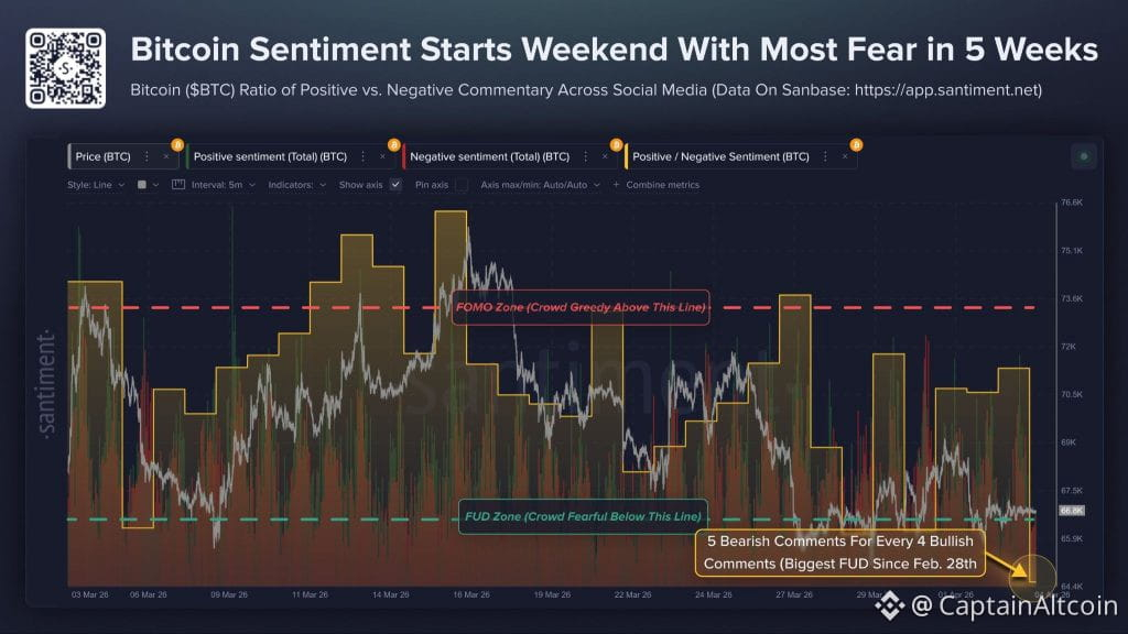 Right now, the BTC price is trading around $66.8K, and social data shows only about 0.81 bullish comments for every bearish one. That leans heavily toward fear. It’s not full-blown panic, but it definitely stands out, especially after weeks where the market felt pretty flat.