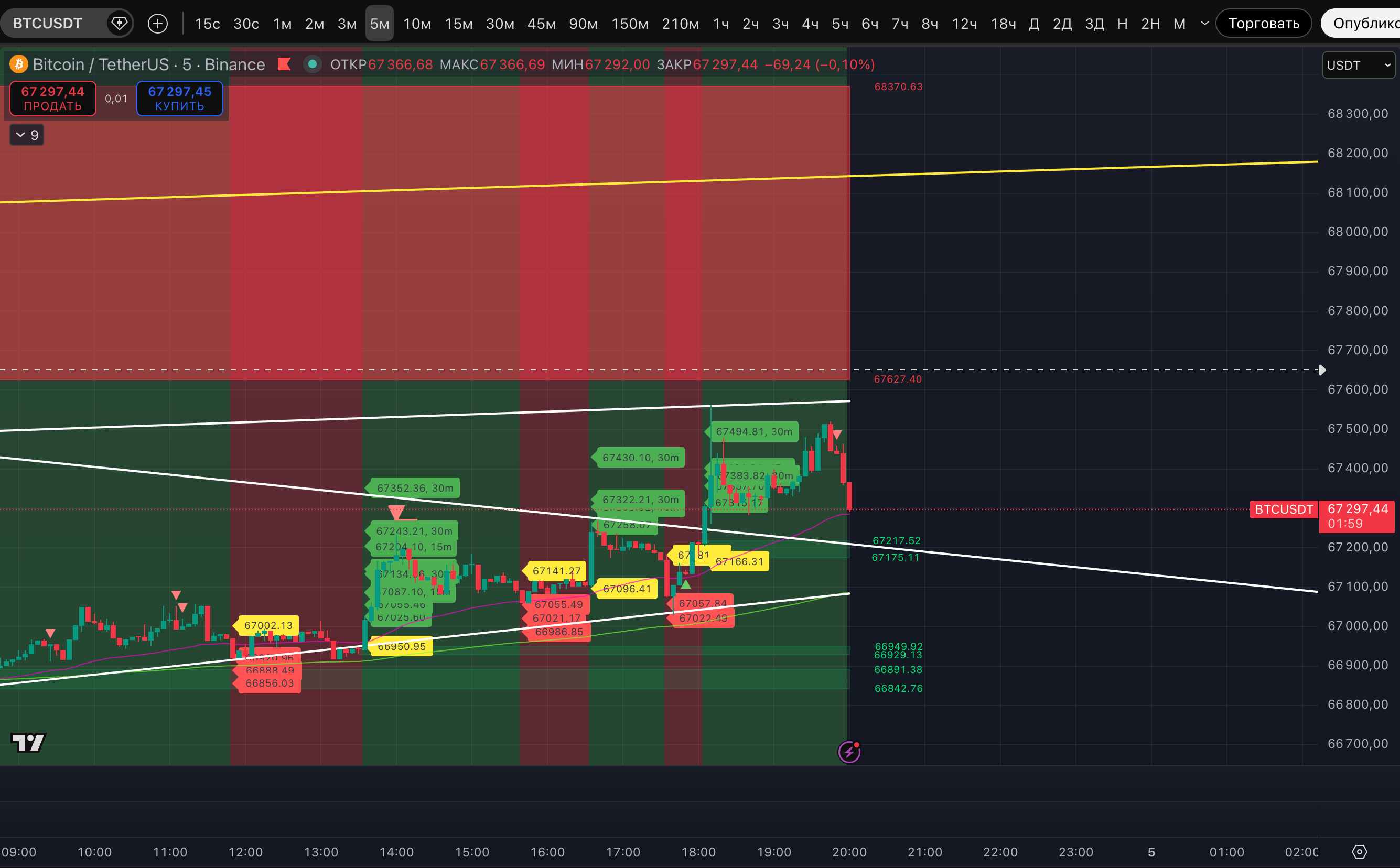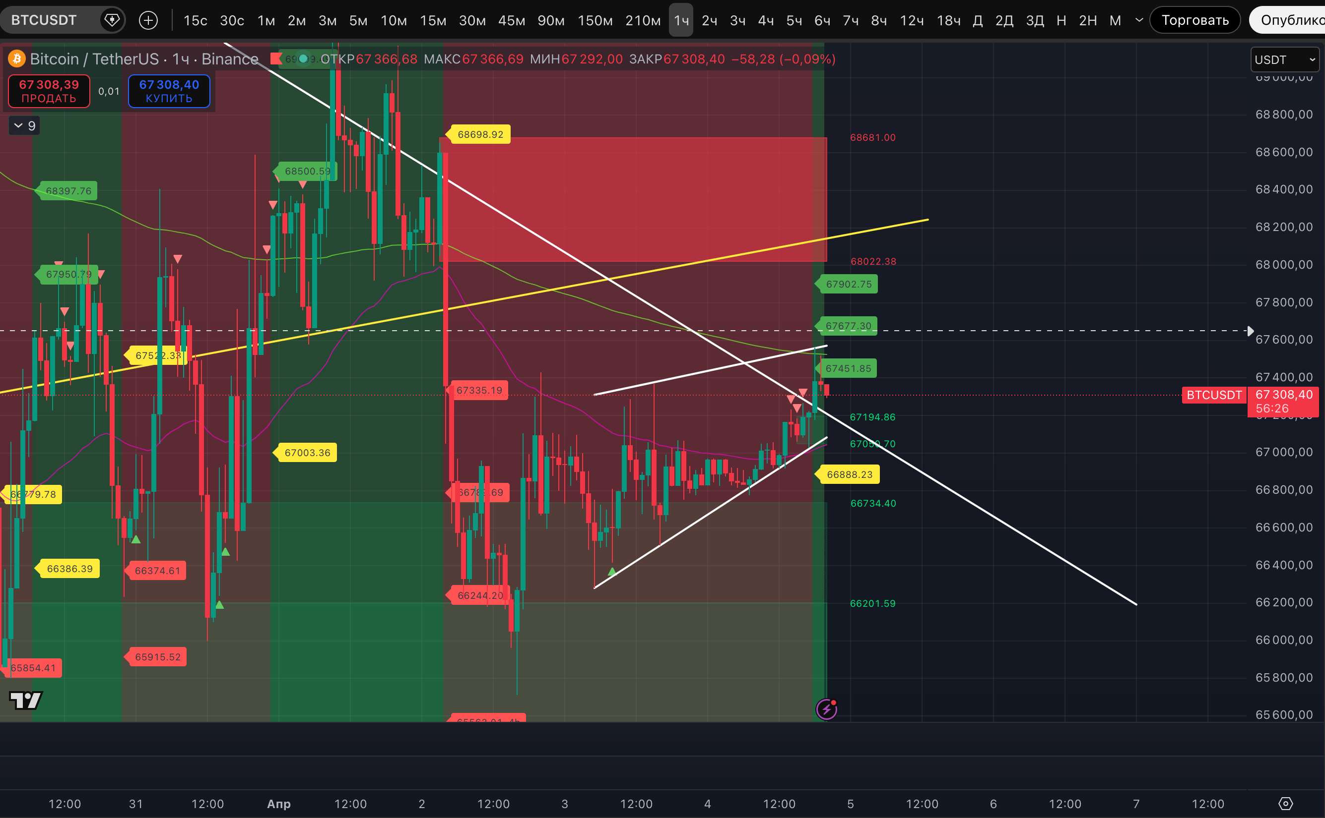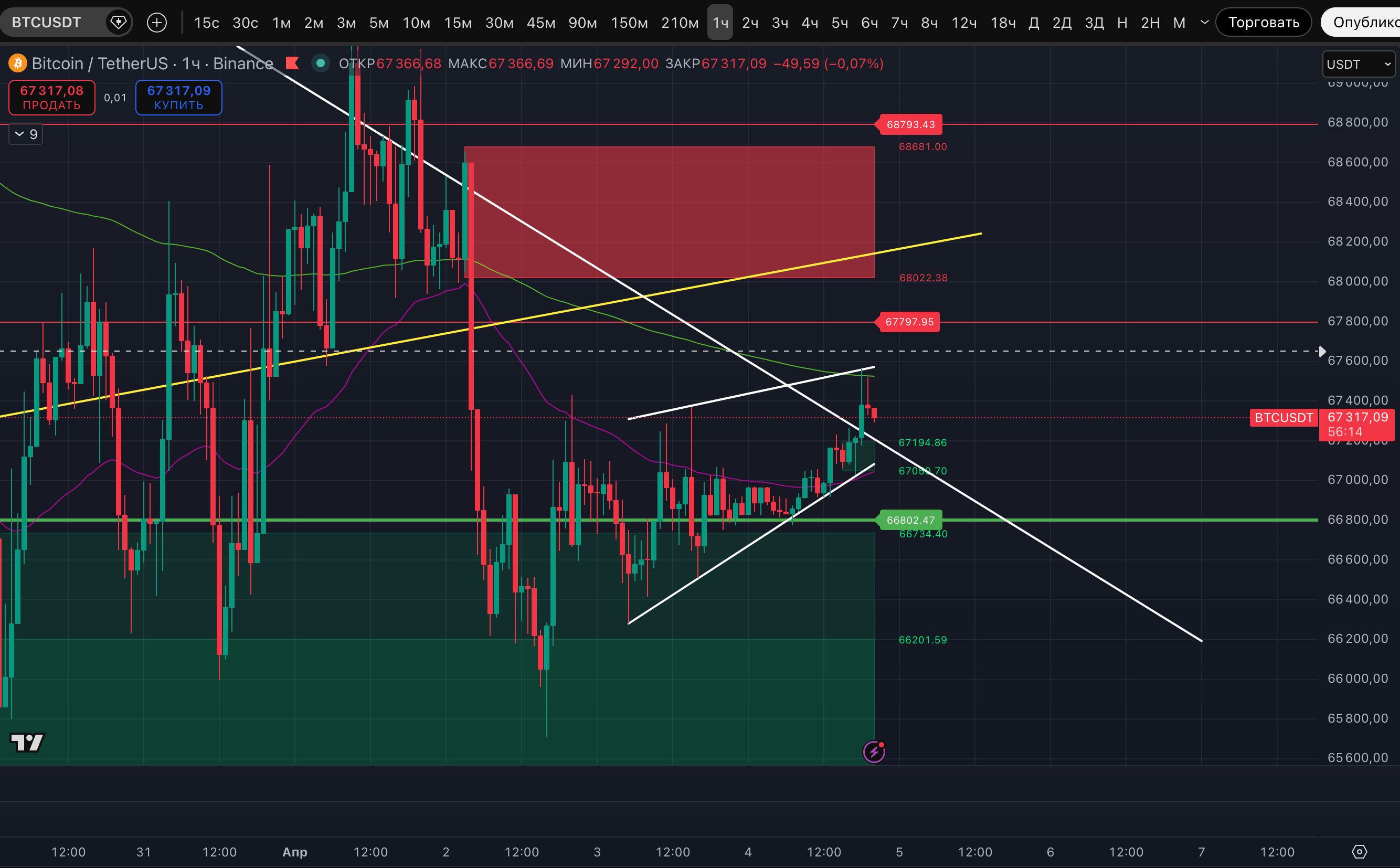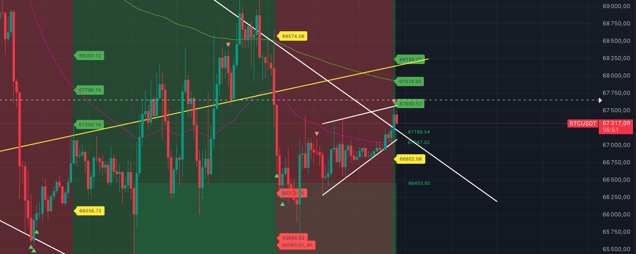 По зонам ликвидности на часовом ТФ ближайшая зона это 68 022-68 681$. На более младших ТФ эта зона отличается, но тоже присутствует, например на 5-минутном ТФ это 67 627-68 370$. Словом, в любом из раскладов зона ликвидности, где должны показать себя продавцы - уже близко.