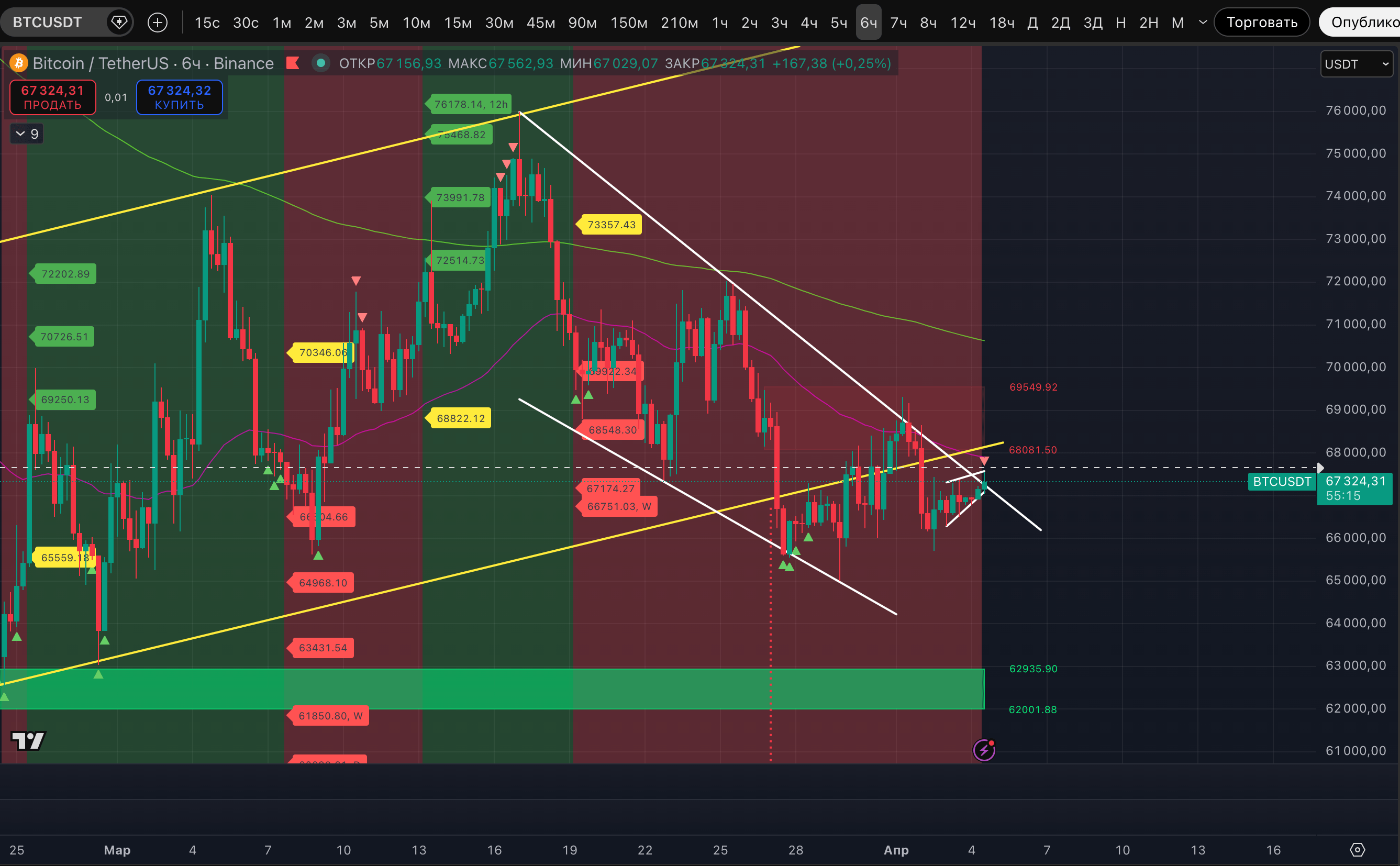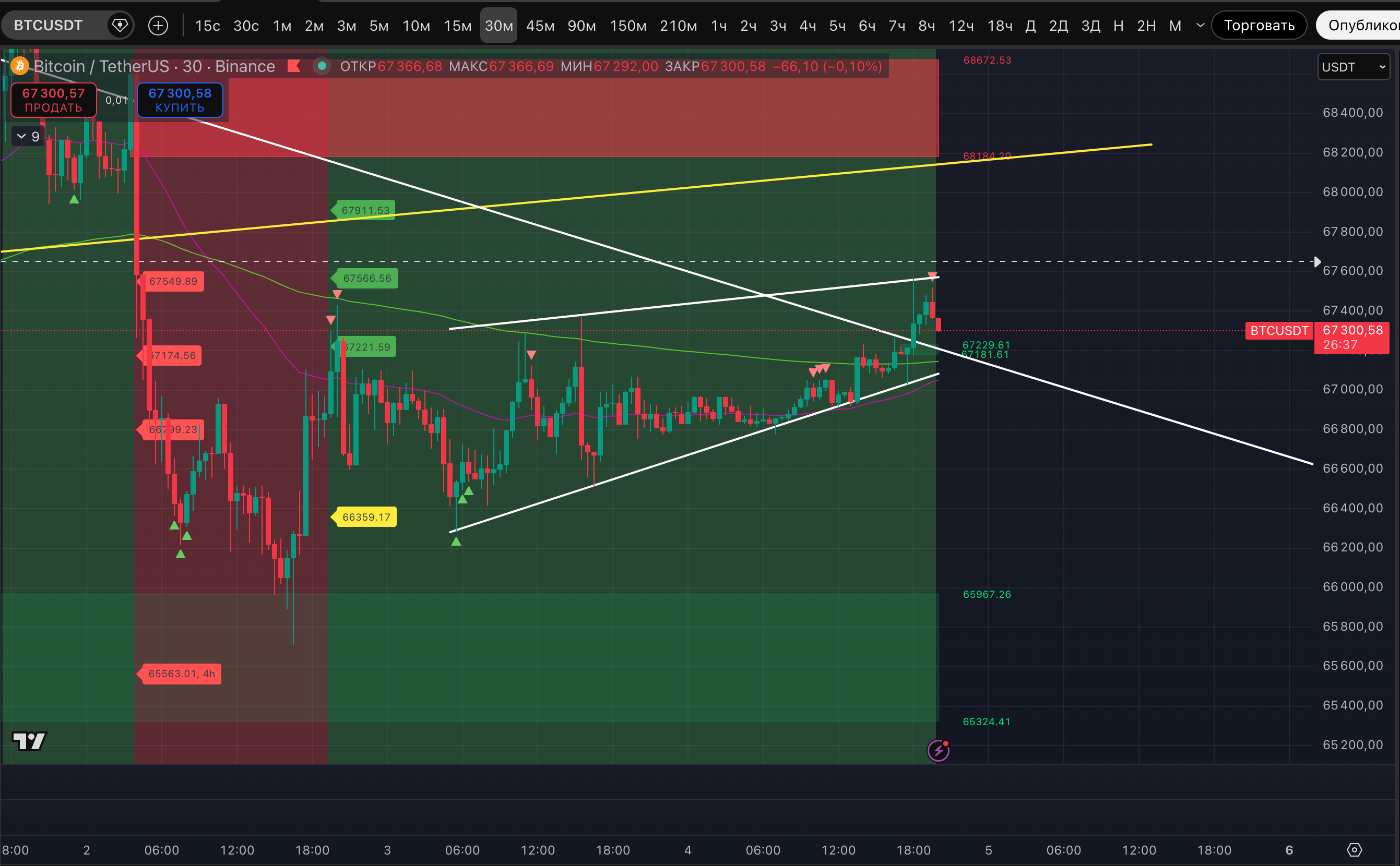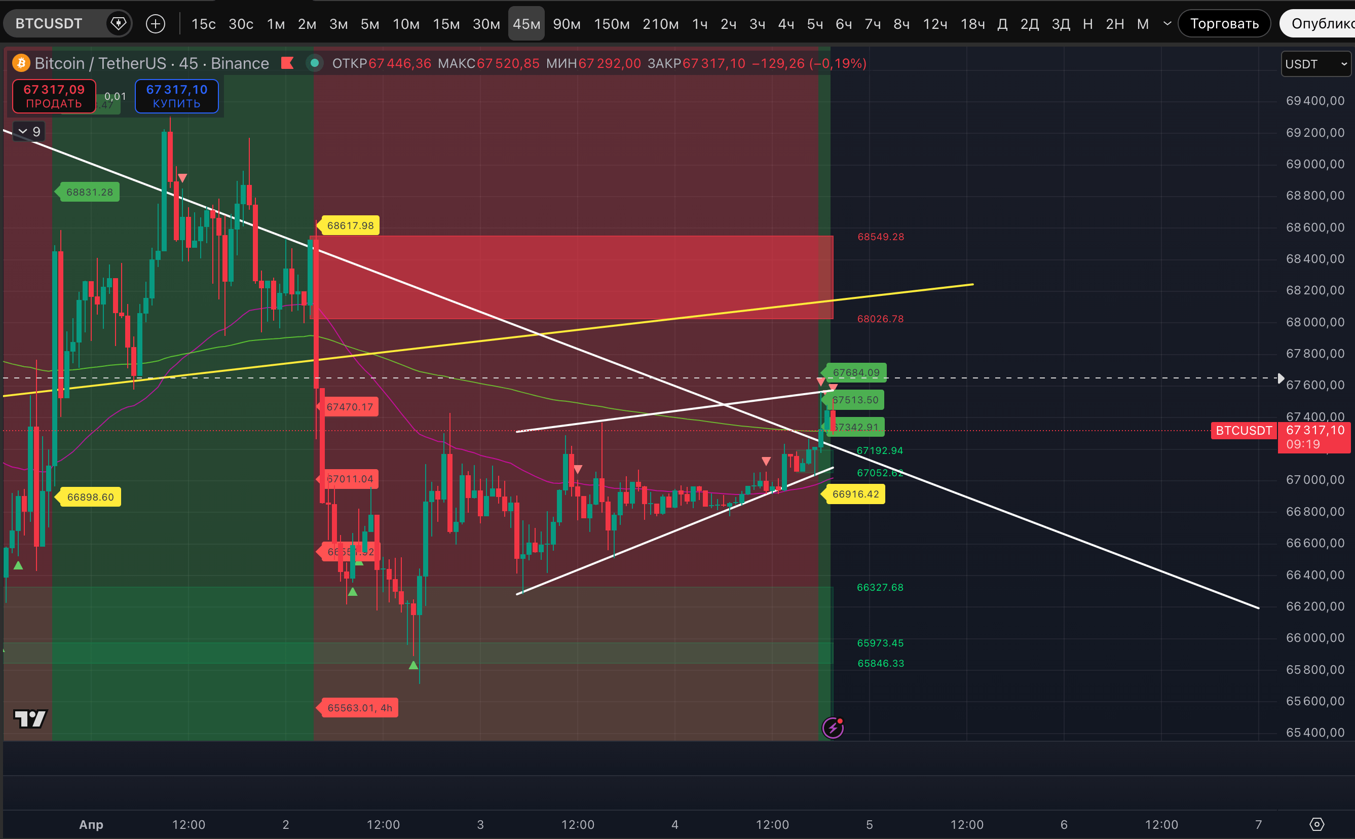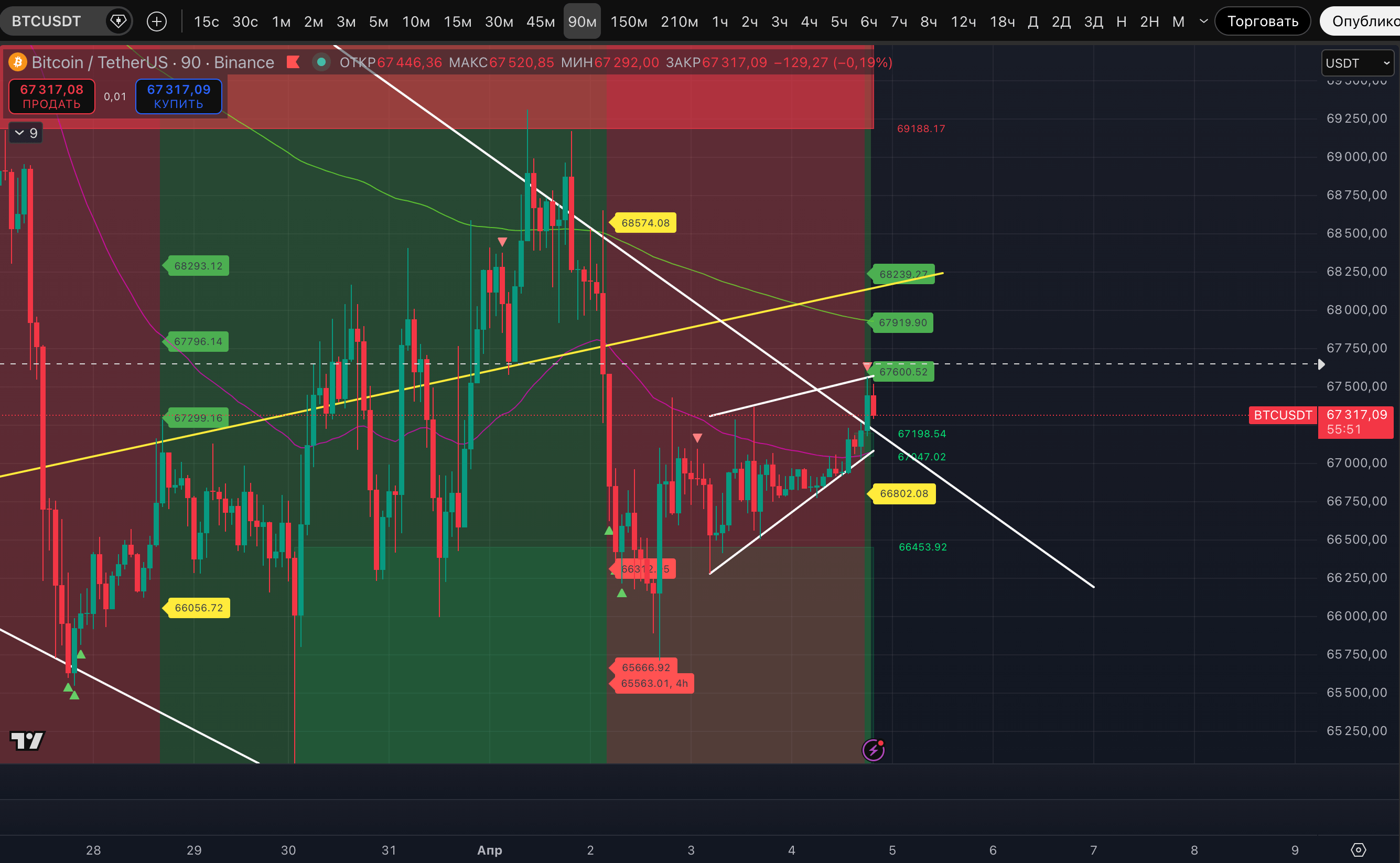 На 1,5-часовом ТФ базовые цели:  67 600$, 67 919$, 68 239$. Уровень потенциального слома - 66 802$. При этом на этом ТФ уже две метки потенциального хая. Также метка потенциального хая есть на 30- и 45-минутном и 6-часовом ТФ.