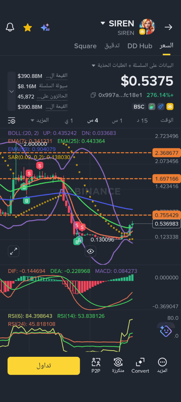 تابع معي اللون اللنفسجي موف هو مؤشر البولينغ باندس حينما يشتد اختناق ويصبح مثل العنق هناك احتمالين :