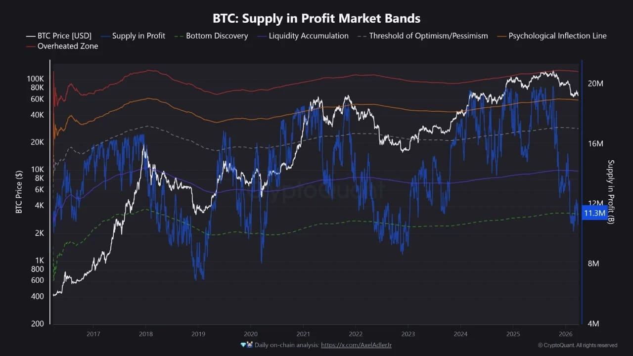 Historically, the Supply in Profit reading has only reached the green band during major bottoms of the Bitcoin cycle. The market quant cites the depths of the crypto winter in the 2018/2019 period as an example; the March 2020 liquidity crisis also features in this data, with the other instance being the late 2022 post-FTX capitulation.