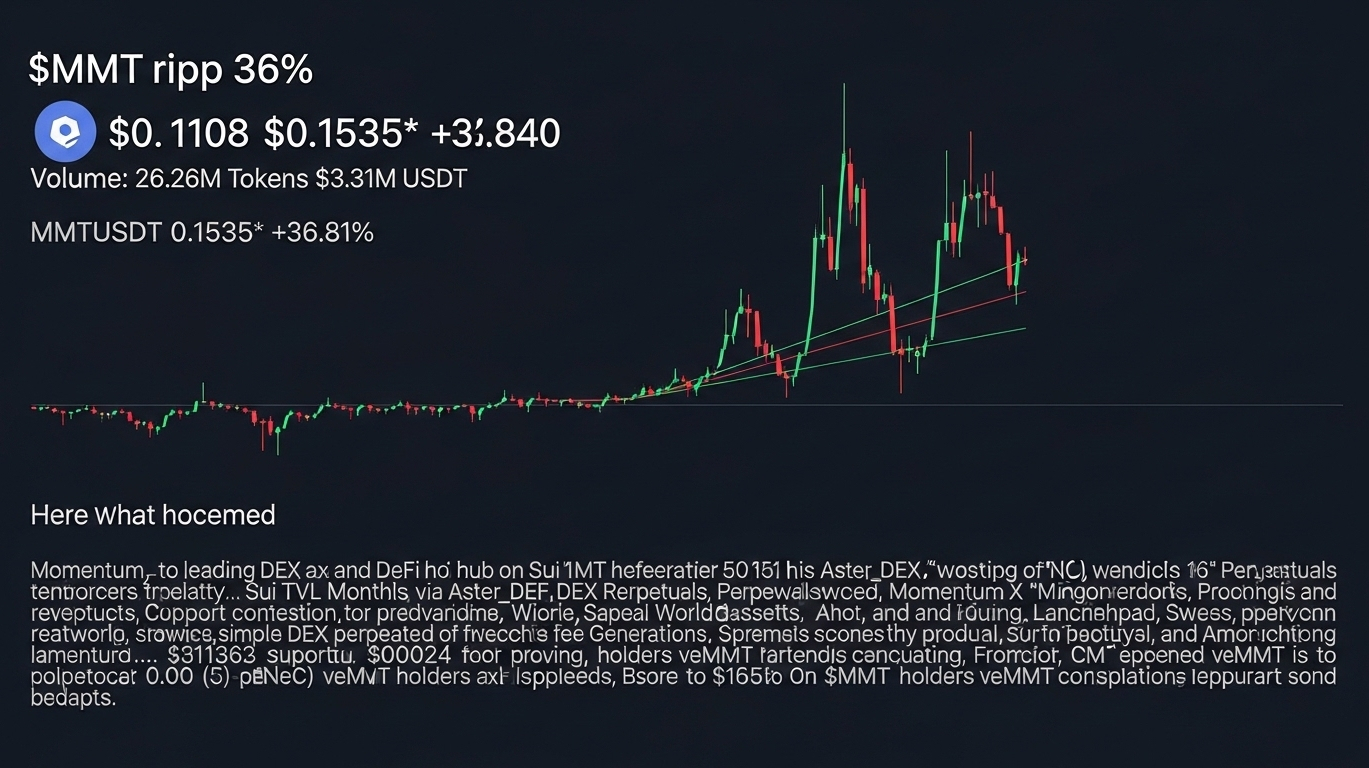 $MMT just ripped 36%, climbing from $0.1108 to $0.1540, now consolidating at $0.1535. 📈 Volume hit 26.26M tokens with $3.31M USDT changing hands. The catalyst? A sharp recovery in Sui-based DeFi activity combined with growing anticipation of Momentum’s roadmap—perpetuals, real-world assets, and a launchpad—drawing fresh speculative capital into the ecosystem. Smart money is front‑running the product narrative. The crowd is chasing the breakout. 👀