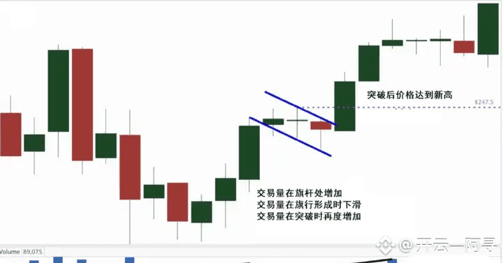 调阶段,形成旗面部分,这种整理通常发生在交易者暂停并巩固头寸之后,随后上升趋势继续。
