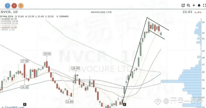 股价格已经上涨了超过40%,并形成了一个高窄旗形形态。该形态的顶部和底部之间的差距仅为