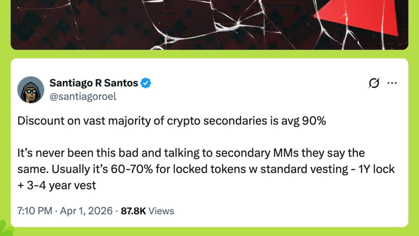 Đầu tuần trước, Santiago Roel Santos cho rằng phần lớn token trên secondary market đang bị chiết khấu tới 90% — “chưa bao giờ tệ đến vậy”.