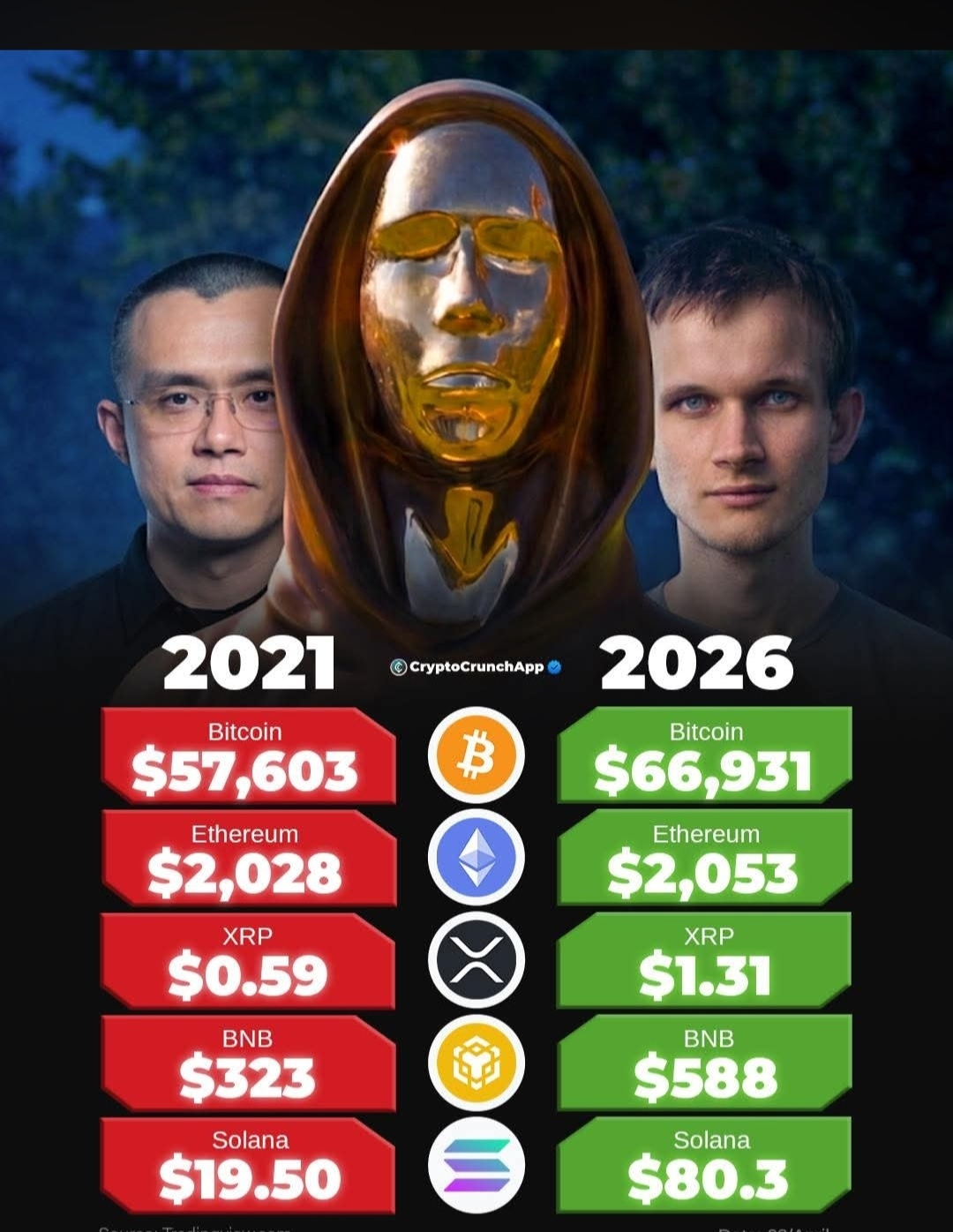 | 2026 | ~$69,674 | ~$2,152 | BTC nearly flat vs 2021 highs; ETH down ~55% from 2021 peak. |