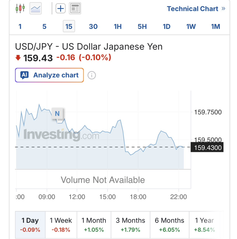 With USD/JPY around 159, the Japanese yen is significantly weak, reflecting prolonged loose monetary policy by the Bank of Japan. A weaker yen can indirectly support crypto markets as capital flows out of JPY into higher-yielding or risk assets, including Bitcoin. This is often amplified by carry trades, where investors borrow cheap yen to invest elsewhere.