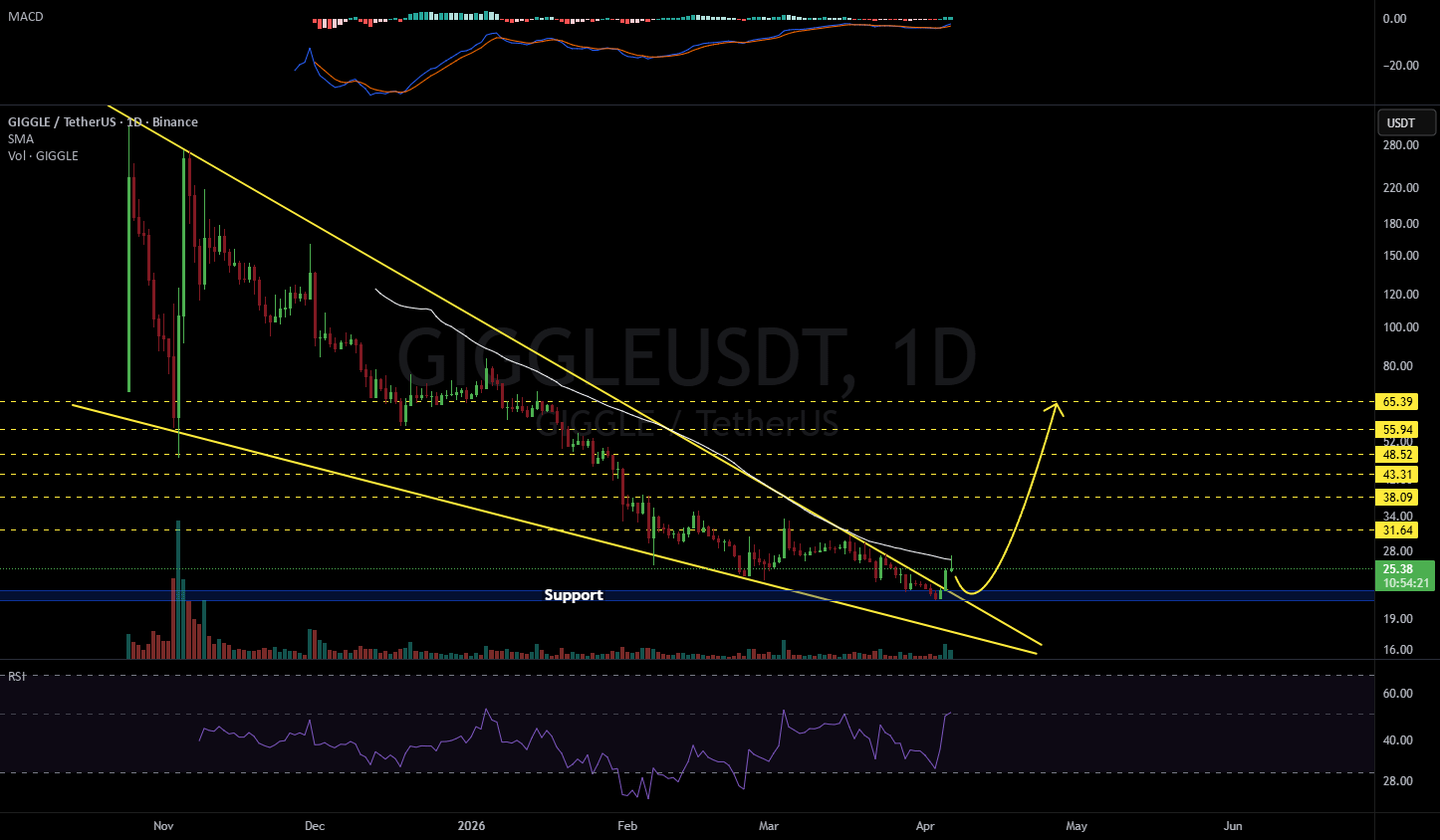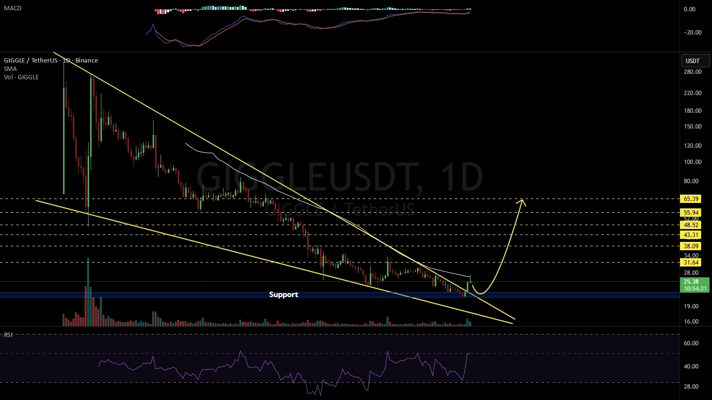 #GIGGLE قد تجاوز مقاومة الوتد الهابط على الرسم البياني اليومي وهو الآن يقترب من SMA50 اليومي. تشير مؤشرات MACD و RSI إلى احتمال استمرار صعودي. ضع في اعتبارك تجميع مركز صغير عند المستويات الحالية وقرب مناطق الدعم. الأهداف المحتملة للصعود هي: