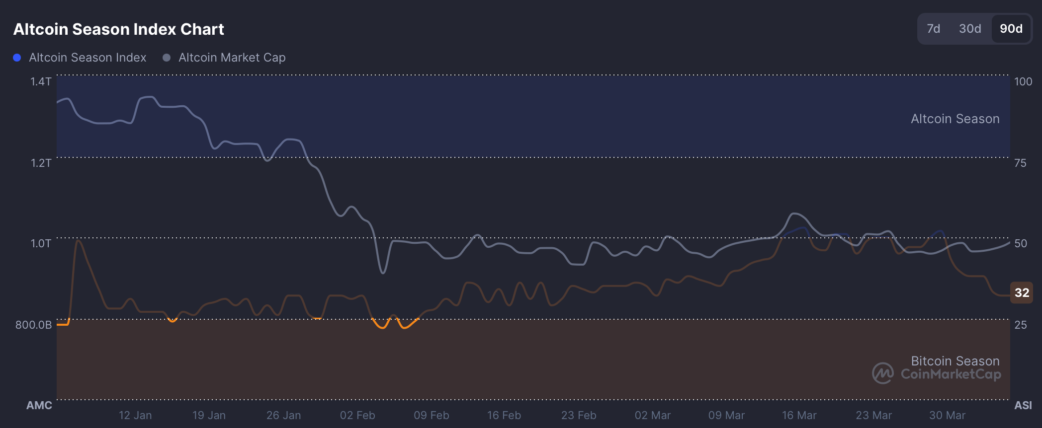 The Altcoin Season Index now reads 32 according to CoinMarketCap. Below 25 is Bitcoin Season by definition, at 32, the market is one bad week away from that threshold. Capital is not rotating into altcoins. It is consolidating around Bitcoin, waiting for a signal that the macro environment is turning.
