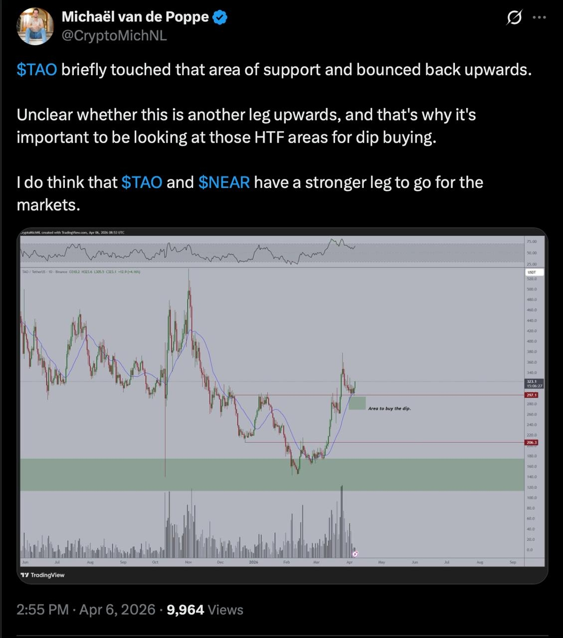 Michaël van de Poppe is focused on the AI and layer-1 segment. He noted that TAO briefly touched support around $297 before bouncing back toward $323, identifying the $280–$300 zone as the area to accumulate on dips. His read on both TAO and NEAR is that they have a stronger recovery leg ahead than the broader altcoin market, not because of short-term momentum, but because of where they sit in the market's structural hierarchy going into a potential risk-on rotation.