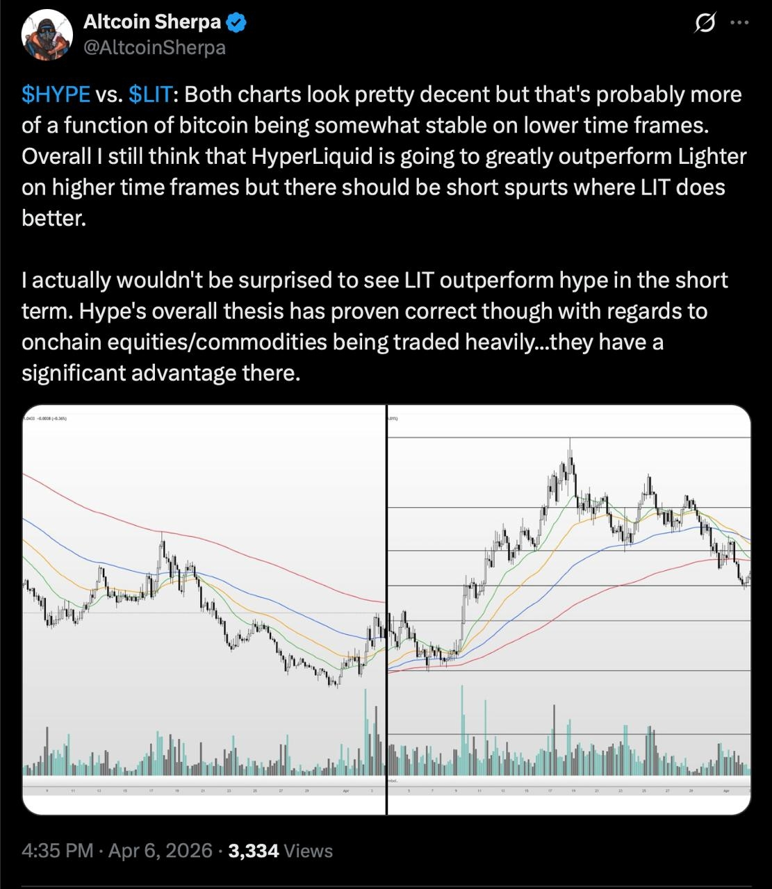 Altcoin Sherpa is looking at a different segment with a different lens. Comparing HyperLiquid and Lighter, he noted that both charts look decent in the short term, then immediately qualified that by attributing it to Bitcoin being temporarily stable rather than to independent altcoin strength.