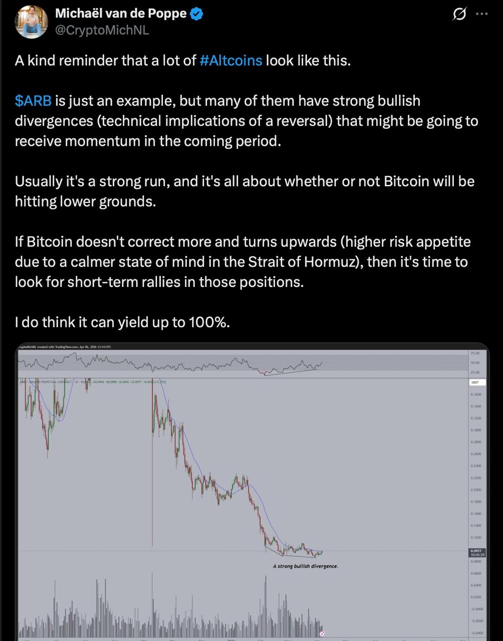 More broadly, van de Poppe flagged that ARB is representative of a pattern now visible across many altcoins: bullish divergences forming after extended downtrends. A bullish divergence, where price makes a lower low but momentum indicators do not, signals that selling pressure is exhausting itself. He sees potential moves of up to 100% in these setups if Bitcoin stabilizes. His explicit condition: reduced tension around the Strait of Hormuz and Bitcoin not making new lows.